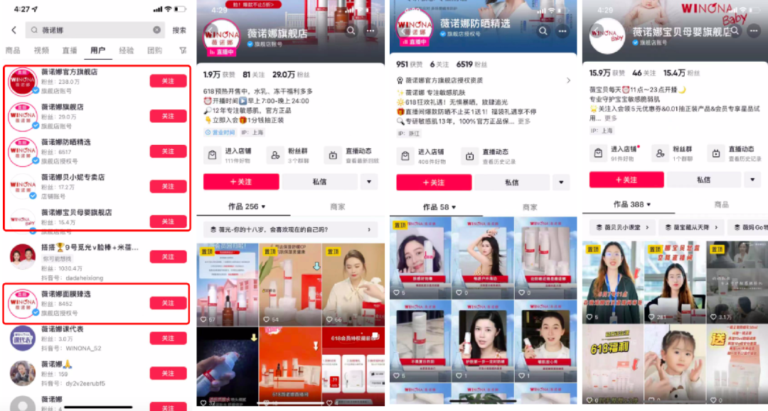 薇諾娜在抖音建立了矩陣,5個賬號總粉絲量超過63萬。視頻內(nèi)容包括品牌宣傳,新品上市、產(chǎn)品種草,護膚知識科普等,賬號主頁都放置了官網(wǎng)的鏈接進行引流。