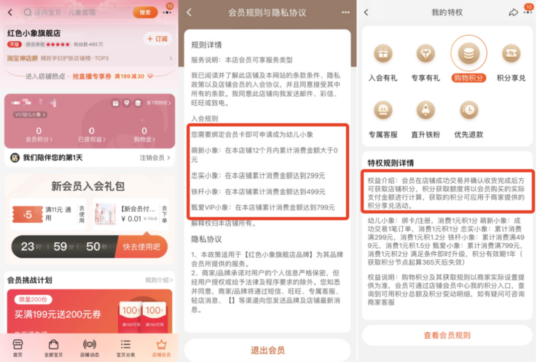 紅色小象電商平臺的會員體系比較完善,主要以成長會員+積分體系為主。下面以天貓平臺的會員體系為例。