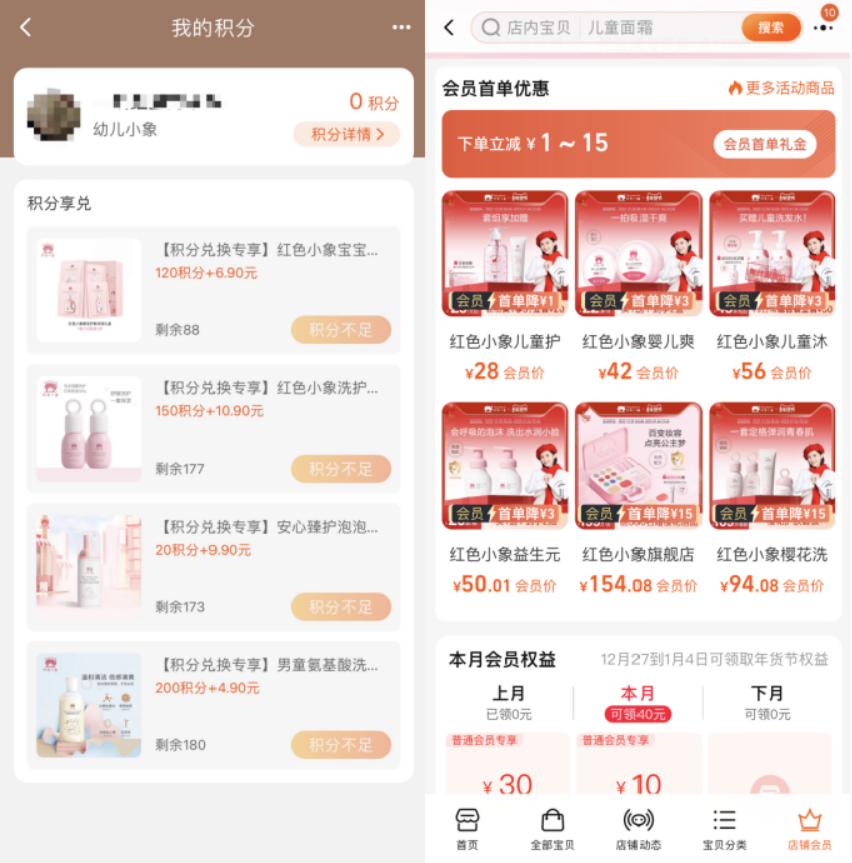 紅色小象在微信小程序和電商平臺都設(shè)置了會員體系,以會員體系+積分體系為主,下面進行詳細(xì)拆解。