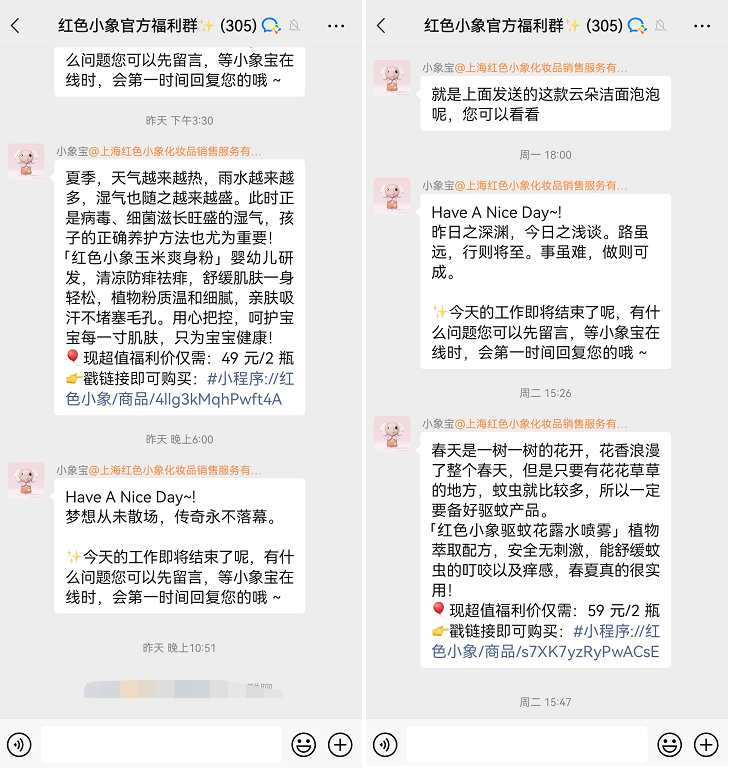 紅色小象的福利群互動較少,主要是福利官發(fā)布活動、產(chǎn)品種草以及維護秩序,發(fā)布頻率也不高,一天1-2次,下面以一天內(nèi)容舉例: