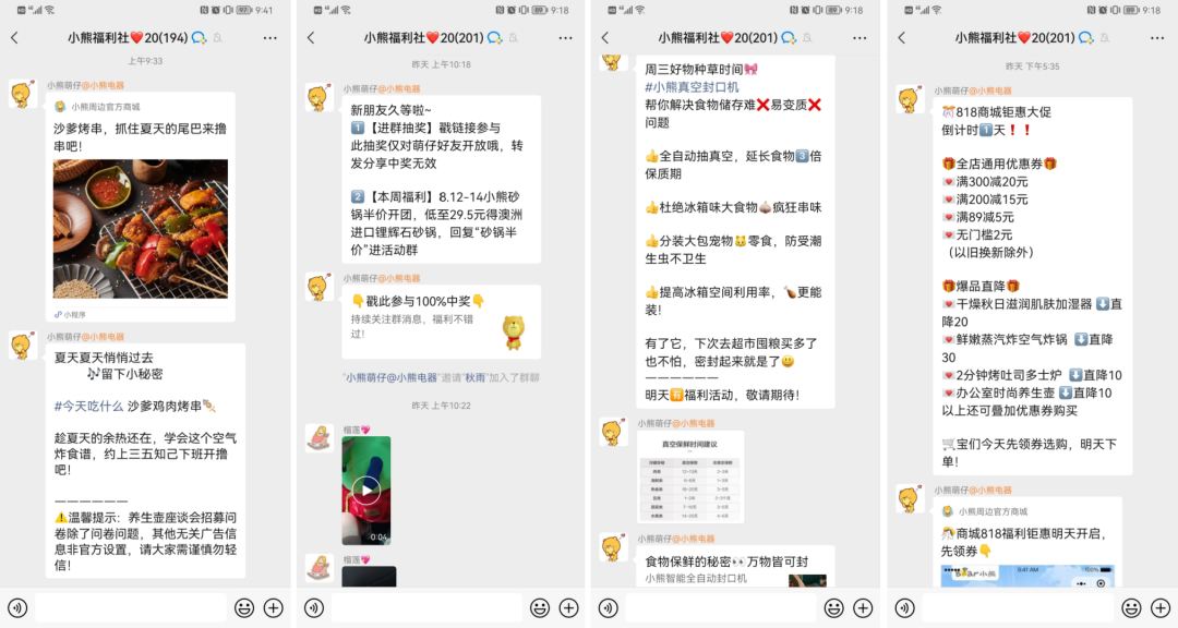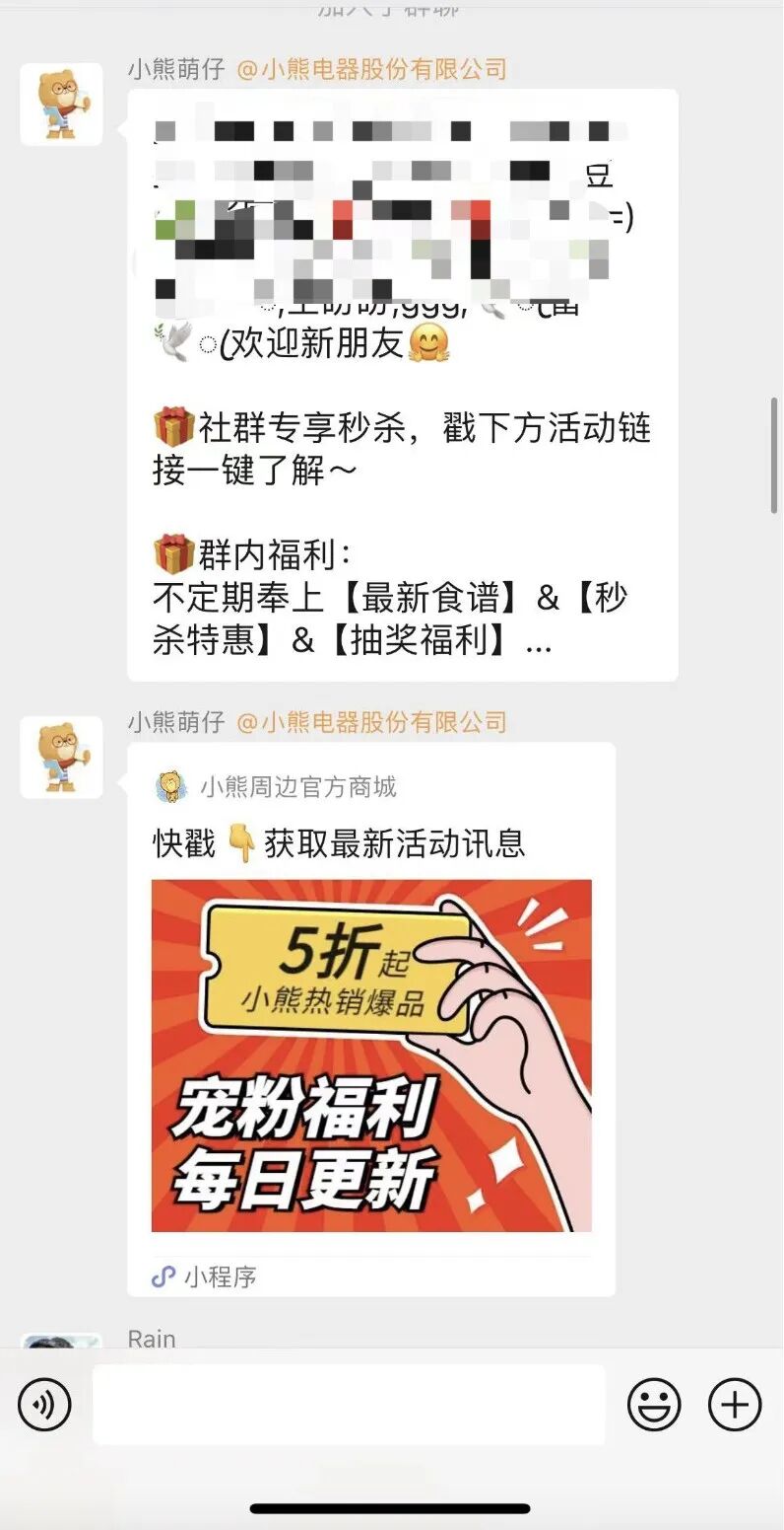 小熊電器通過社群鏈接用戶,增加產(chǎn)品的曝光和轉(zhuǎn)化。下面以我添加的社群為例進(jìn)行詳細(xì)拆解。