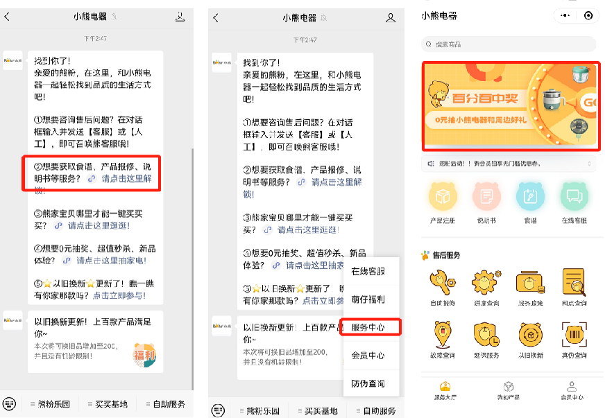 小程序觸點(diǎn):【小熊電器】公眾號(hào)自動(dòng)歡迎語中的第2點(diǎn)服務(wù),點(diǎn)擊后即可轉(zhuǎn)入【小熊服務(wù)】小程序;或從公眾號(hào)一級(jí)菜單“自助服務(wù)”—“服務(wù)中心”進(jìn)入【小熊服務(wù)】小程序。