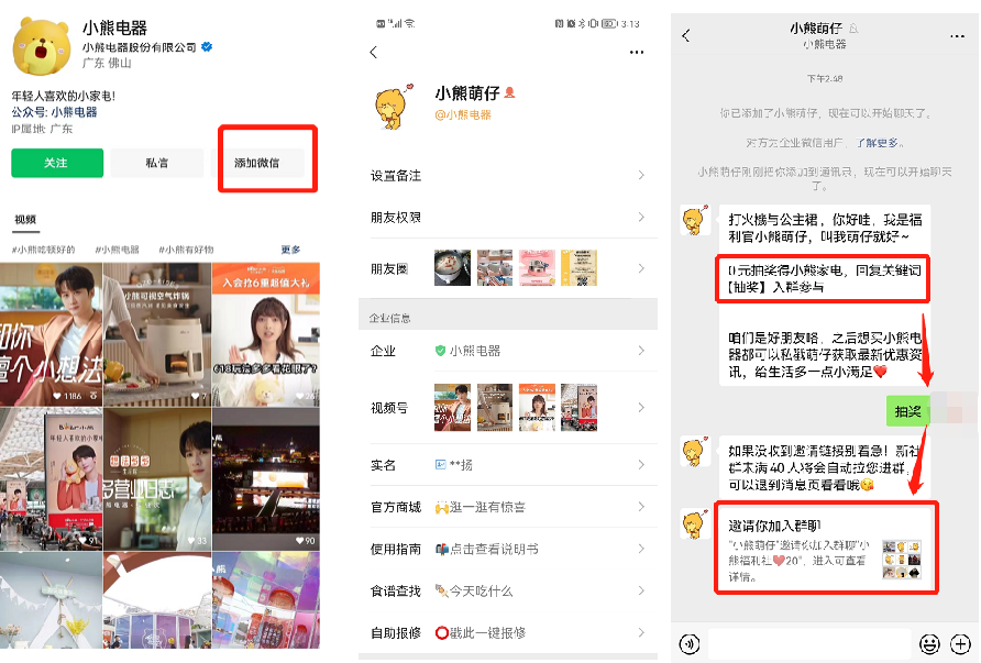 ③視頻號(hào):在【小熊電器】的視頻號(hào)賬號(hào)主頁,有設(shè)置福利官【小熊萌仔】的企微,添加后,回復(fù)關(guān)鍵字“抽獎(jiǎng)”,即可入群。