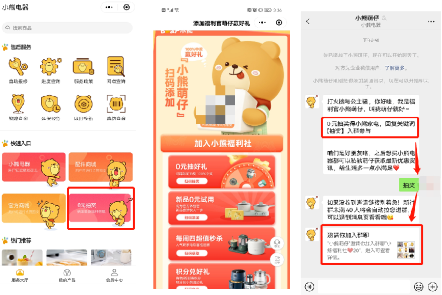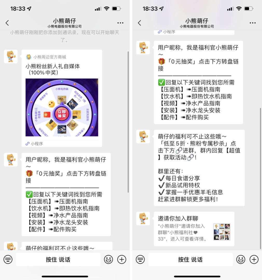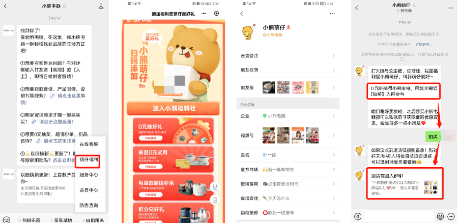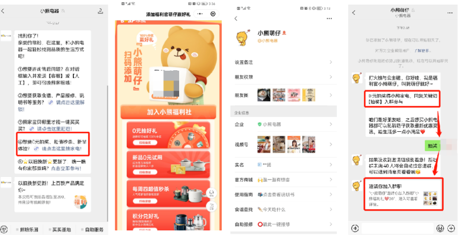 路徑1:關(guān)注【小熊電器】公眾號(hào)后,在自動(dòng)歡迎語有入群利益點(diǎn),吸引用戶點(diǎn)擊了解,添加福利官【小熊萌仔】,回復(fù)關(guān)鍵字“抽獎(jiǎng)”,即可進(jìn)群。