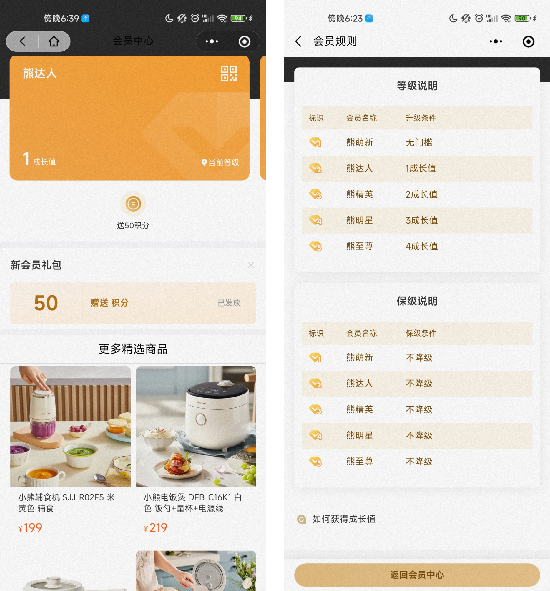 小熊電器在微信小程序和電商平臺(tái)都設(shè)置了會(huì)員體系,具體以成長會(huì)員+積分體系為主,下面分平臺(tái)進(jìn)行詳細(xì)拆解。