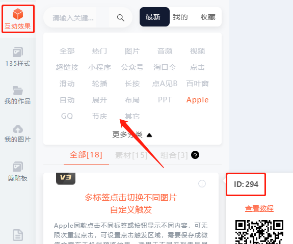 進(jìn)入網(wǎng)頁(yè)后,選擇【互動(dòng)效果】—素材—Apple專區(qū),找到ID為294,多標(biāo)簽點(diǎn)擊切換不同圖片SVG,詳細(xì)制作教程如下: