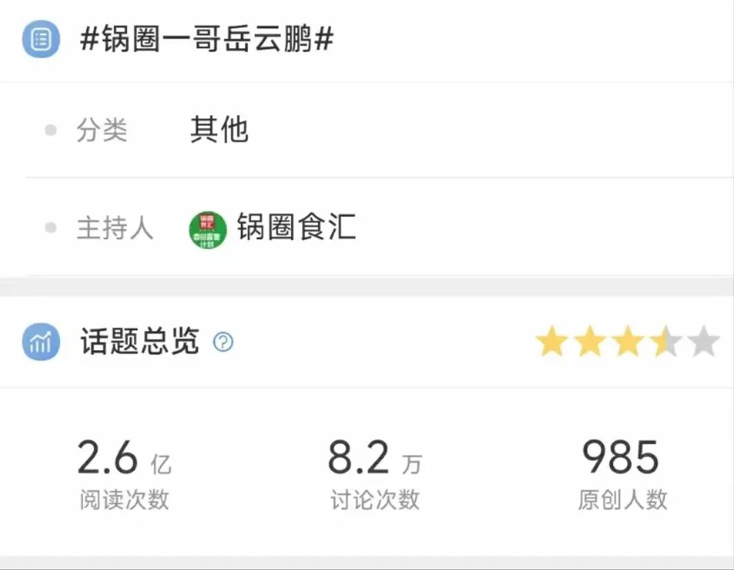 一方面是看中明星的流量,增加品牌曝光機(jī)會(huì)。岳云鵬作為近幾年春晚的“常客”,國民度極高,微博粉絲超 2900 萬。其發(fā)布一條與鍋圈相關(guān)的廣告,就能引起 3.9 萬轉(zhuǎn)發(fā),5.3 萬點(diǎn)贊。帶動(dòng)的話題 #鍋圈一哥岳云鵬 閱讀量達(dá) 2.6 億。