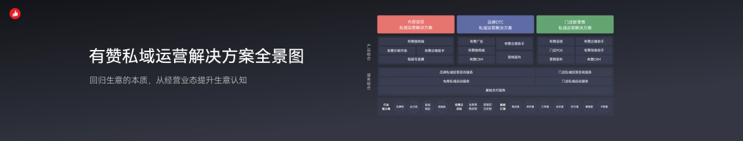 2022 年有贊將他們的業(yè)務(wù)從“開(kāi)店?duì)I銷解決方案”全面向“私域運(yùn)營(yíng)解決方案”升級(jí),升級(jí)了針對(duì)內(nèi)容變現(xiàn) 、品牌 DTC 、門店新零售三大類客群的私域運(yùn)營(yíng)解決方案。
