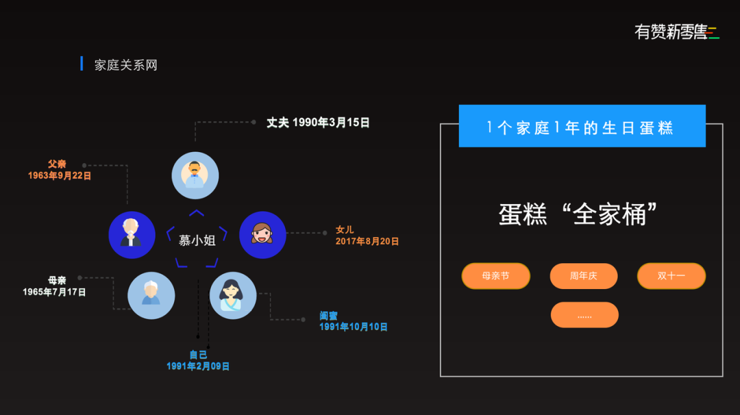 生日蛋糕是一個(gè)低頻消費(fèi)的種類,因?yàn)槊磕昝總€(gè)人生日就只有一次。如何提高生日蛋糕的復(fù)購(gòu)率,成為行業(yè)共同的難點(diǎn)。但黛慕卻通過(guò)打造家庭關(guān)系網(wǎng),鎖定了一個(gè)家庭一年的蛋糕消費(fèi),復(fù)購(gòu)率大大提升。