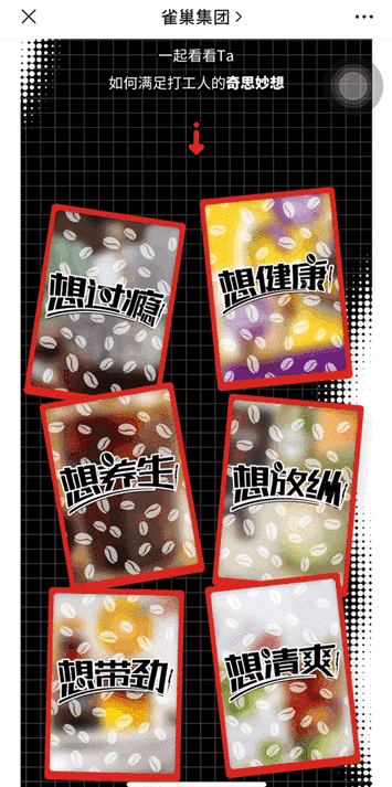 這篇文章介紹的是雀巢咖啡系列產(chǎn)品,圍繞這個主題,推文分享了多款咖啡產(chǎn)品與其他食材進行DIY的可能性,產(chǎn)品介紹圖并沒有平鋪直敘展示,而是做成卡片的形態(tài),并借助圖片彈窗SVG,引導(dǎo)用戶點擊之后再彈出咖啡產(chǎn)品圖。提高了推文的神秘感和趣味性。