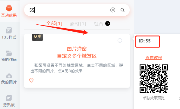 在SVG頁面的【互動效果】的搜索框輸入55,或者是“圖片彈窗”關(guān)鍵詞,放入到編輯頁面。