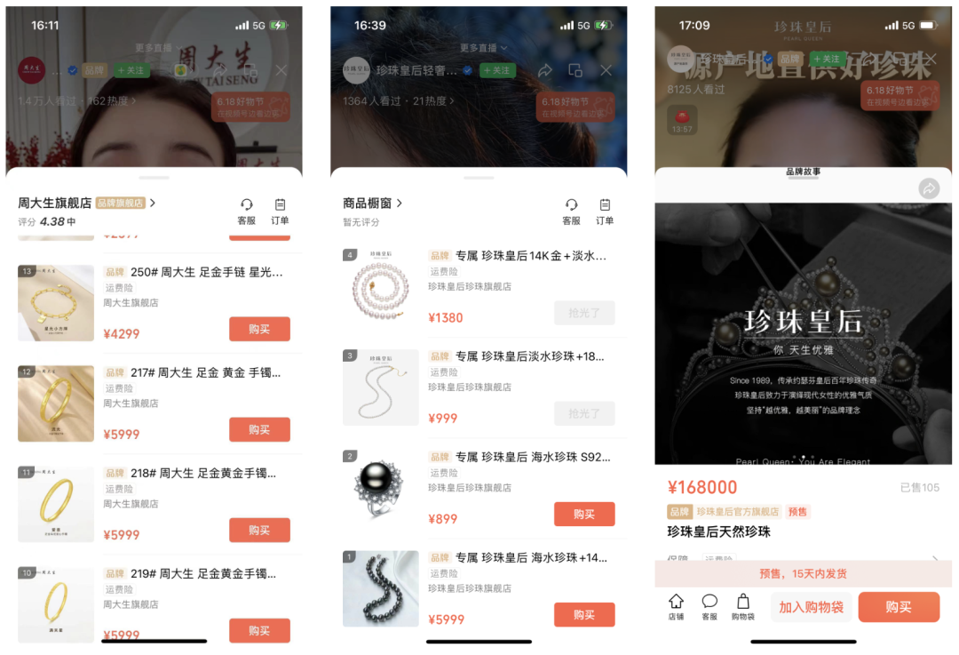 在視頻號上帶貨,珠寶品牌有哪些特殊的打法模式?接下來,我們將從618品牌帶貨榜單中選取排名靠前的幾家珠寶品牌:中國黃金、周大生、珍珠皇后、京潤珍珠,從直播間的人貨場拆解出發(fā),為回答上述問題提供一部分觀察視角,同時(shí),延展出一些新的思考,希望能夠給將要入局或者正在觀望的珠寶品牌些許啟發(fā)。