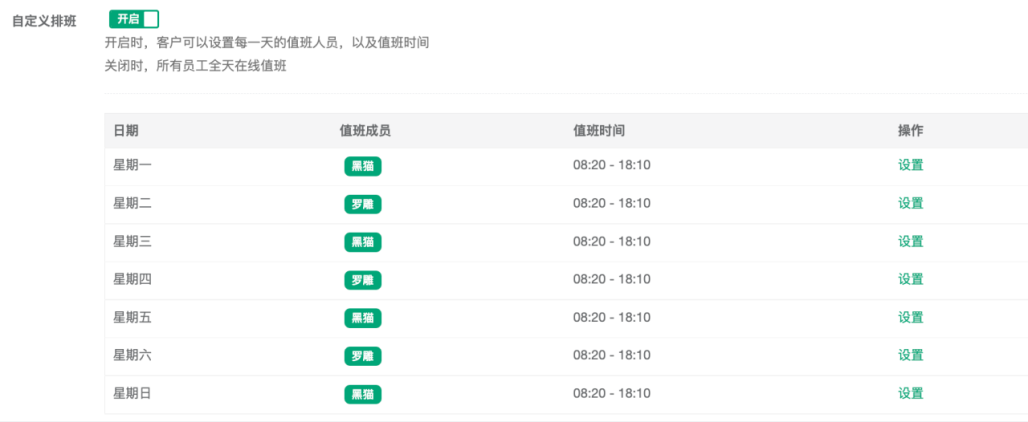 若關(guān)閉自定義排班,則隨機(jī)添加員工設(shè)置里的員工。管理員還可以設(shè)置排班制度,細(xì)分至每日的某個(gè)工作時(shí)間段,其余時(shí)間段安排值班員工,確保企業(yè)在各個(gè)時(shí)段都有員工接待。