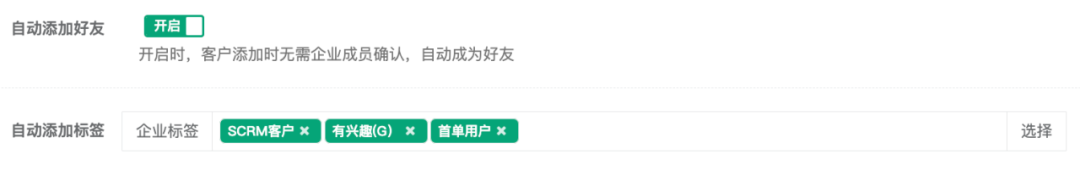 還可以開啟自動(dòng)添加好友,客戶掃碼添加好友時(shí),無(wú)需員工手動(dòng)確認(rèn)就能直接添加員工好友;選擇添加該渠道碼下的單個(gè)或多個(gè)企業(yè)標(biāo)簽,用戶掃碼成功添加就會(huì)被自動(dòng)打上提前設(shè)置好的對(duì)應(yīng)標(biāo)簽。