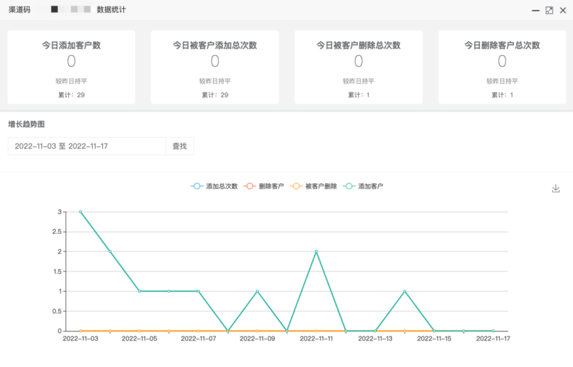 渠道投放后,還能實(shí)時(shí)查看各渠道用戶添加數(shù)、增長(zhǎng)趨勢(shì)圖、流失數(shù)據(jù)等詳細(xì)效果數(shù)據(jù)。便于統(tǒng)計(jì)各渠道數(shù)據(jù),幫助企業(yè)分析渠道質(zhì)量,為后續(xù)推廣做決策。
