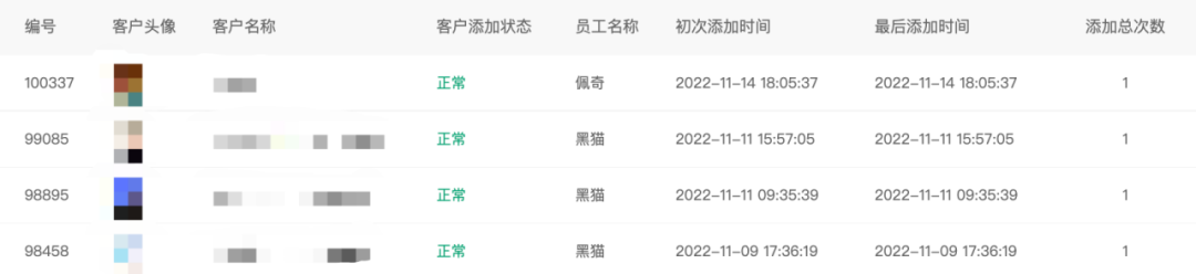 渠道碼設(shè)置完成后,可以將其投放至對(duì)應(yīng)渠道,用戶掃碼添加企業(yè)微信后,管理員可以查看掃渠道碼的客戶名稱、客戶添加狀態(tài)、歸屬員工、添加時(shí)間、添加次數(shù)等信息。