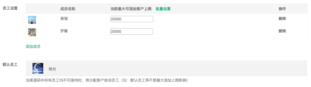 當(dāng)渠道碼中所有員工均不可接待時(shí),將分配客戶給默認(rèn)員工,且默認(rèn)員工不受最大添加上限影響。