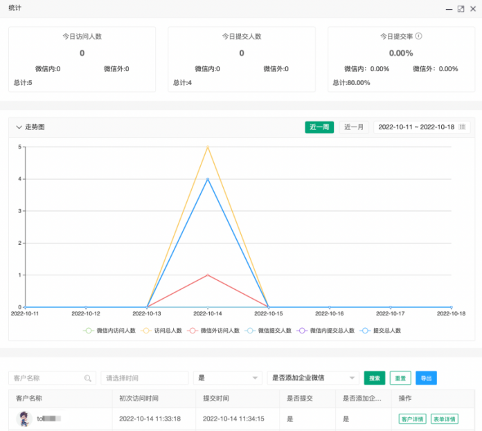 管理員可隨時(shí)查看用戶填寫(xiě)數(shù)據(jù)并一鍵導(dǎo)出。客戶訪問(wèn)總數(shù)、提交人數(shù)、提交率等一目了然,單個(gè)客戶詳情和表單詳情頁(yè)可定向查看。