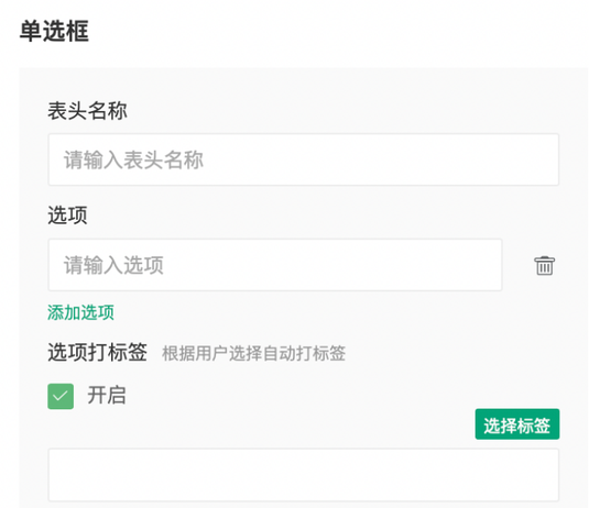 在選擇使用單選框或多選框時(shí),管理員可在單個(gè)題目下根據(jù)用戶選項(xiàng)自動(dòng)打標(biāo)簽,如單選題有AB兩個(gè)選項(xiàng),用戶選擇A選項(xiàng)會(huì)為其打上A對(duì)應(yīng)的標(biāo)簽,選擇B選項(xiàng)則打上B對(duì)應(yīng)的標(biāo)簽。