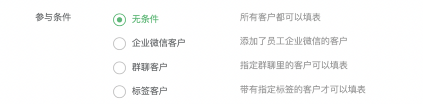 表單填寫(xiě)若想要發(fā)給定向人群,則可以設(shè)定參與門檻,如選擇指定企業(yè)微信客戶、指定群聊客戶、指定標(biāo)簽客戶的人參加,那么此條件外的客戶則無(wú)法參與此問(wèn)卷填寫(xiě)。