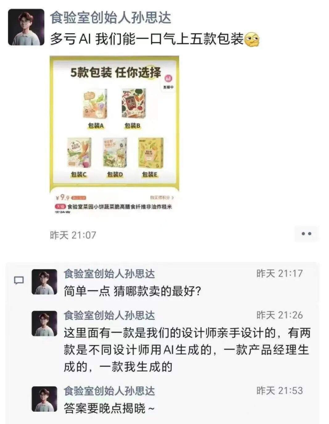 AIGC 第二個(gè)熱門場景是利用 Midjourney、Stable Diffusion 等圖片生成類 AI 工具生產(chǎn)海報(bào)、商品圖、產(chǎn)品外包裝以及創(chuàng)意視頻。上文提到飛豬能夠在 1 小時(shí)就產(chǎn)出 1000 張廣告圖片正是利用的繪圖軟件。科技媒體@36氪 前兩天做了一個(gè)測試,以 0 成本用 AI 工具開了一家淘寶店,節(jié)約了數(shù)萬元,還成功賣出去第一單。其中店鋪名、產(chǎn)品文案、商品信息由 ChatGPT 生產(chǎn),店鋪 logo、產(chǎn)品實(shí)拍圖、模特圖、標(biāo)簽設(shè)計(jì)圖等靠繪圖軟件 Midjourney 輸出。AI 工具輸出圖片設(shè)計(jì)的好處是,能在短時(shí)間內(nèi)輸出大量的設(shè)計(jì)方案,供商家選擇。比如,某個(gè)品牌上新了一款快消品,過去設(shè)計(jì)師設(shè)計(jì) 3 款外包裝,需要一周時(shí)間。有時(shí)候?yàn)榱粟s新品上架周期,即便 3 款包裝中沒有特別滿意的方案,也必須將就性地選一款上線。但 AI 工具可以在 2 個(gè)小時(shí)內(nèi)輸出上百款不同的方案,商家完全可以選到滿意為止。此外,在一些對(duì)廣告圖片需求量較大的場景,AI 繪圖工具“量大速度快”的特點(diǎn)也能更好地滿足商家需求。比如游戲投放常常會(huì)要求面向不同的人群展示差異化的圖片信息,常常一款游戲上新可能需要大量宣傳圖片,這時(shí)候 AI 工具的高效率就十分適用。除了上述兩個(gè)場景,另外在數(shù)字人 AI 直播、一鍵簡化營銷流程等方面,也有很多企業(yè)在嘗試創(chuàng)新。之后,運(yùn)營社還會(huì)針對(duì)「數(shù)字人直播」專門輸出一篇文章,大家可以期待一下。看了這么多應(yīng)用 AI 工具的案例,商家究竟該如何借助 AIGC 賣產(chǎn)品?運(yùn)營社聯(lián)系上一位號(hào)稱已經(jīng)“賴上”AI 的品牌操盤手孫思達(dá)(網(wǎng)紅零食品牌食驗(yàn)室創(chuàng)始人),分享他們是怎么從 0 開始學(xué)習(xí)并應(yīng)用 AI 工具的全過程。據(jù)了解,食驗(yàn)室是新崛起的零食品牌,主打產(chǎn)品是無油、高蛋白的健康零食,深受年輕人喜歡。他們從 0 到月 GMV 破 1500 萬元僅用了 3 年時(shí)間。公司用戶、員工甚至老板( 90后 )都是年輕人,食驗(yàn)室是潮流國貨品牌的代表。他們的零食創(chuàng)意層出不窮,包裝新潮,公司經(jīng)營理念也很前衛(wèi),所以也是最早嘗試 AI 工具的消費(fèi)品牌之一。4 月初,食驗(yàn)室上線了第一款由 AI 主導(dǎo)營銷的新品菜園小餅。根據(jù)孫思達(dá)的介紹,這款新品的包裝、海報(bào)、文案,甚至短視頻腳本均由 AI 完成。食驗(yàn)室第一次嘗試 AI,源于一場實(shí)驗(yàn)。當(dāng)時(shí)他們看到 ChatGPT、Midjourney 等 AI 工具已經(jīng)能生產(chǎn)出豐富、酷炫的內(nèi)容,參與圍觀“吃瓜”的同時(shí)孫思達(dá)產(chǎn)生了好奇:作為消費(fèi)品牌,能怎樣利用 AI 工具?“腦海中,第一個(gè)場景就是產(chǎn)品外包裝?!?/strong>帶著這個(gè)想法,孫思達(dá)在公司發(fā)起了一場實(shí)驗(yàn):讓 CEO(孫思達(dá)本人)、產(chǎn)品經(jīng)理、內(nèi)部設(shè)計(jì)師、外部設(shè)計(jì)師 4 個(gè)人分別利用 AI 工具設(shè)計(jì) 4 款新產(chǎn)品的外包裝,并限時(shí)半天。同時(shí),讓設(shè)計(jì)師用傳統(tǒng)方式單獨(dú)設(shè)計(jì)一款外包裝以便數(shù)據(jù)對(duì)比。在此之前,孫思達(dá)幾乎沒有 AI 繪圖的經(jīng)驗(yàn),也完全不懂設(shè)計(jì)。他選擇讓“ AI 訓(xùn)練 AI ”,讓 ChatGPT 向 Midjourney 提供描述詞。他把此舉形容為開盲盒,但因?yàn)槟軌蛑貜?fù)操作,也能選出一款滿意的包裝。設(shè)計(jì)師則把 AI 當(dāng)作落地工具,用 Midjourney 實(shí)現(xiàn)海中的構(gòu)思的藍(lán)圖。也因?yàn)樵O(shè)計(jì)師提供的描述詞更專業(yè)且精準(zhǔn),所以效率最高。最后 5 款(4 款 AI 設(shè)計(jì)+一款人工設(shè)計(jì))外包裝方案在經(jīng)過美工臨摹后,全部推向市場進(jìn)行銷量測試。其中,設(shè)計(jì)師用 AI 生成的包裝最受歡迎。孫思達(dá)告訴運(yùn)營社:“這個(gè)實(shí)驗(yàn)讓我們感受到 AI 工具可以顯著提高工作效率,也證明了 AI 參與的設(shè)計(jì)同樣被消費(fèi)者認(rèn)可,大家愿意買單?!?/strong>據(jù)他介紹,過去食驗(yàn)室設(shè)計(jì)新品外包裝的周期通常在一個(gè)星期,而這次實(shí)驗(yàn)他們僅用了半天,還包含學(xué)習(xí) AI 工具的時(shí)間。AI 帶來的效率提升讓人震撼,順理成章地 AI 工具也就成為食驗(yàn)室的標(biāo)配。除了能提高效率,AI 還能幫助食驗(yàn)室節(jié)約成本。由 AI 工具主導(dǎo)設(shè)計(jì)的新品宣傳圖