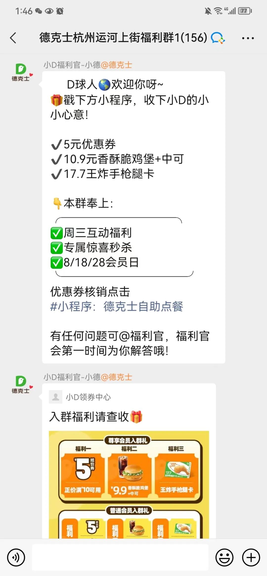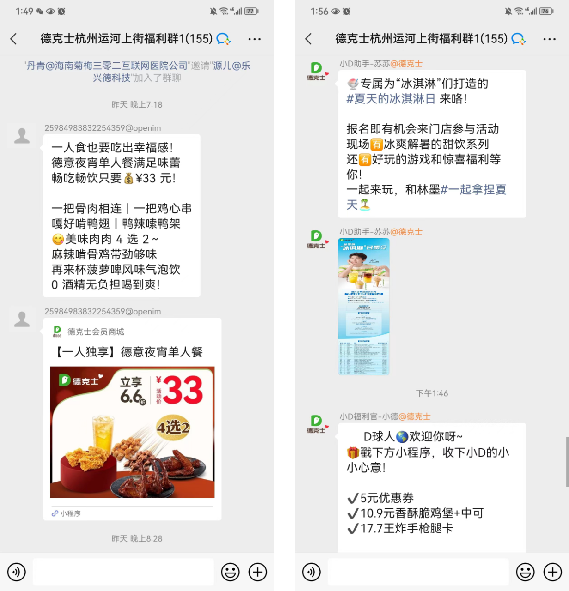 德克士社群會在每日12:00、18:00等時間段準時在群內(nèi)發(fā)布產(chǎn)品種草和福利活動內(nèi)容。