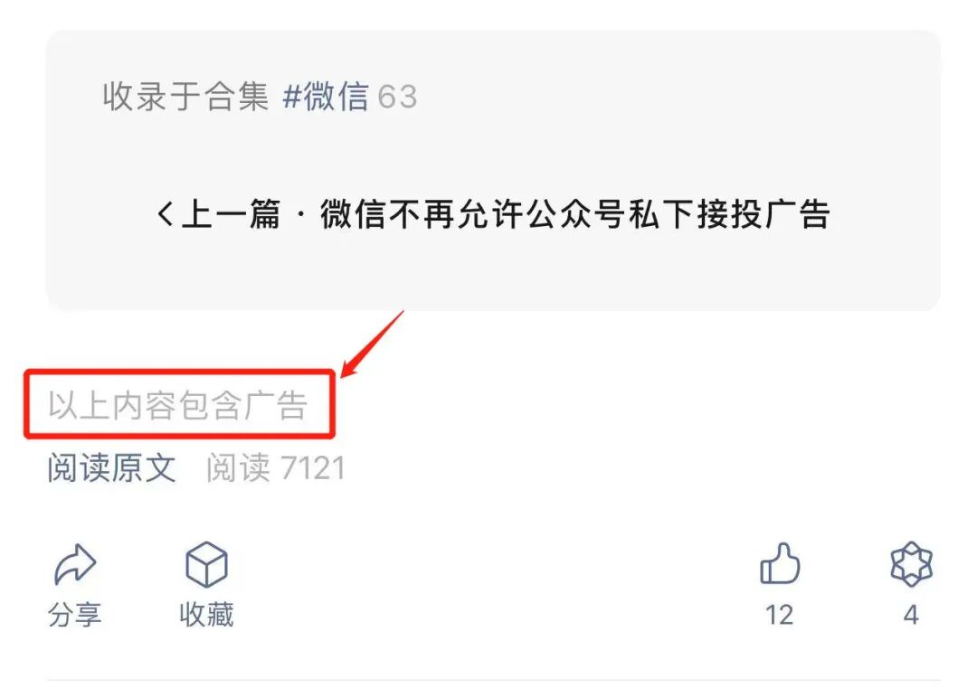 公眾號做了一個(gè)廣告內(nèi)容的自動(dòng)識別,只要系統(tǒng)對文章進(jìn)行掃描后,認(rèn)為有廣告的內(nèi)容風(fēng)險(xiǎn),就會(huì)在文章的最底部打上一段文字提醒:以上內(nèi)容包含廣告。