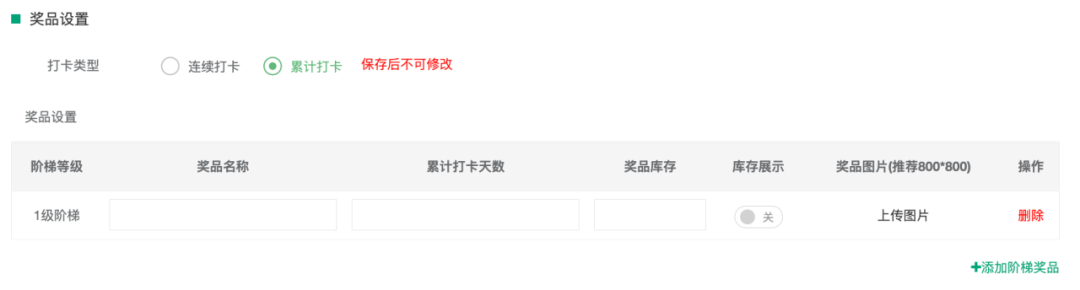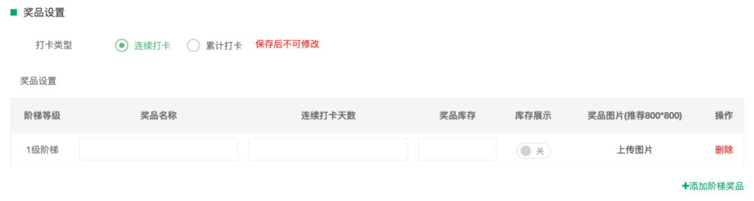 比如現(xiàn)在準(zhǔn)備做一場為期1個月的打卡7天領(lǐng)紅包的活動,若選擇“連續(xù)打卡”,則用戶需要每日持續(xù)打卡,連續(xù)打卡7天后即可領(lǐng)獎;
