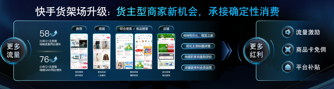 2023 年 快手 Q1 泛貨架場域流量同比增長 58%,GMV 同比增長76%,取得了相當好的成績。