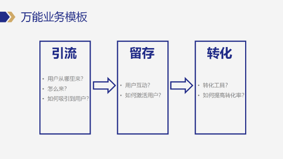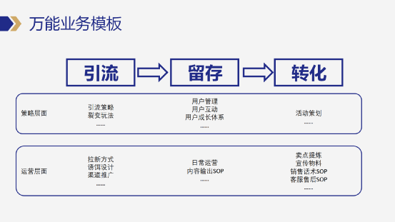 在運營領域其實有一個萬能的業(yè)務模板,即引流、留存、轉化這三個核心環(huán)節(jié)。無論是什么類型的業(yè)務,其實都可以套用這個模板。比如社群運營、用戶增長、電商等等的。所以企業(yè)私域營銷當然也可以套用這個模板。
