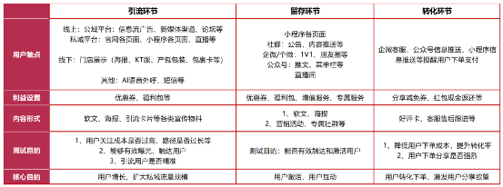 比如,在策略層面,引流環(huán)節(jié),需要制定具體的引流策略和輸出方案,包括裂變營銷的具體玩法;而在留存環(huán)節(jié),要制定用戶管理策略、用戶互動策略、用戶成長體系等等,在轉化環(huán)節(jié),可以策劃活動促銷方案。
