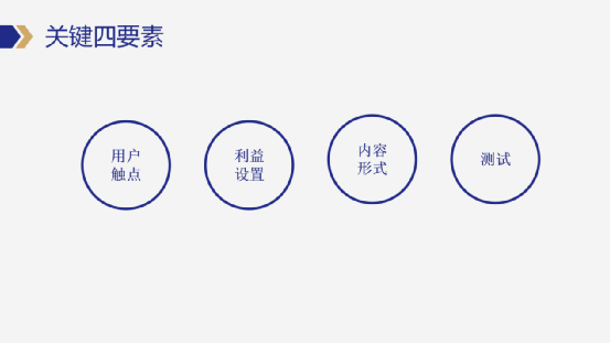 而具體的策略,就是圍繞著用戶觸點、利益設置、內容形式以及測試這四個關鍵要素去進行具體工作上的開展。