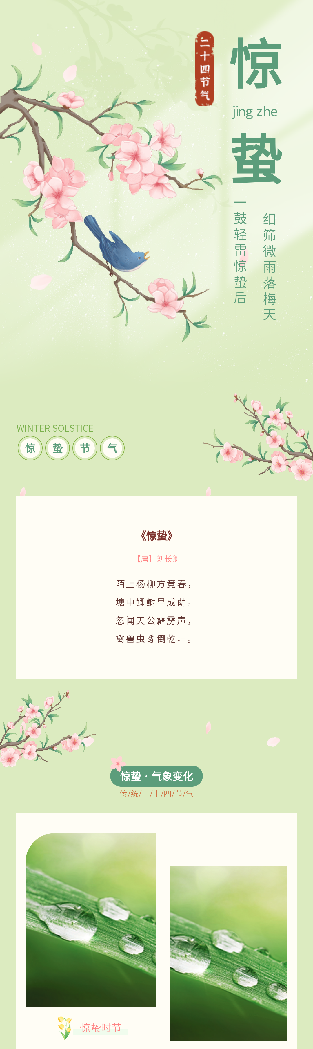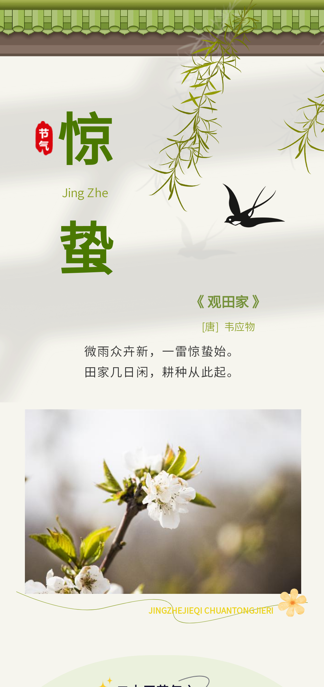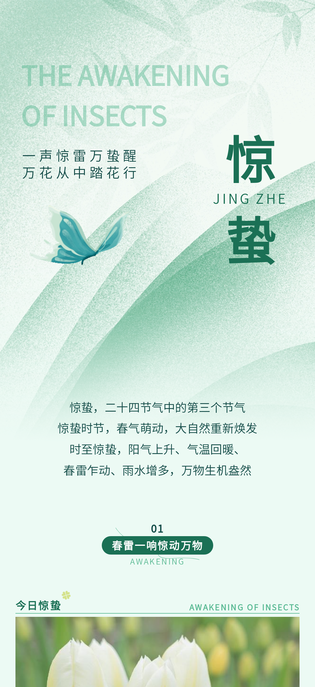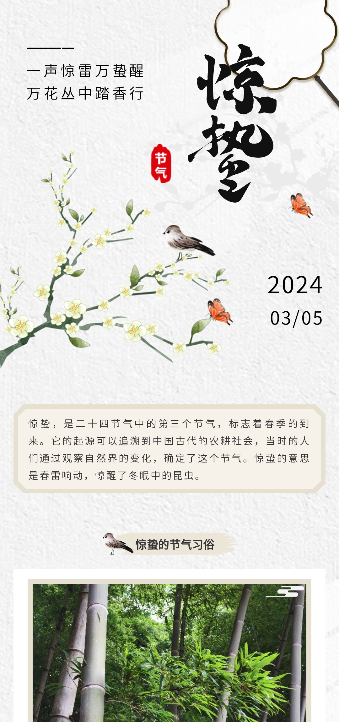 2024年3月5日驚蟄將至,萬物復蘇。在比格設計和135編輯器,你可找到精美驚蟄海報和模板,輕松打造個性化圖文。驚蟄是仲春時節(jié),春雷初響,萬物復蘇,寓意生命力和希望。