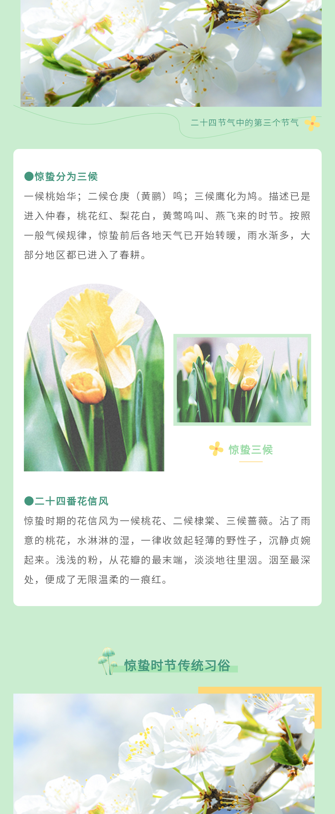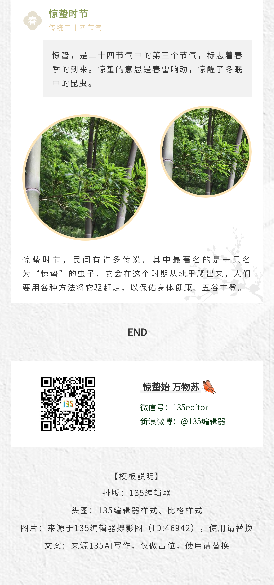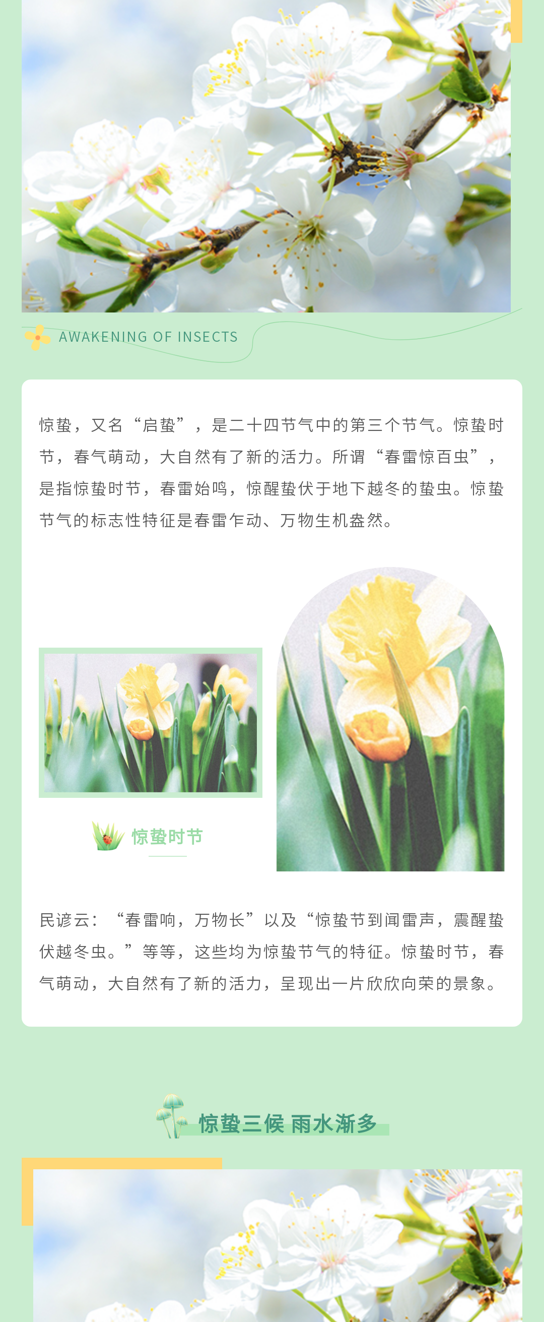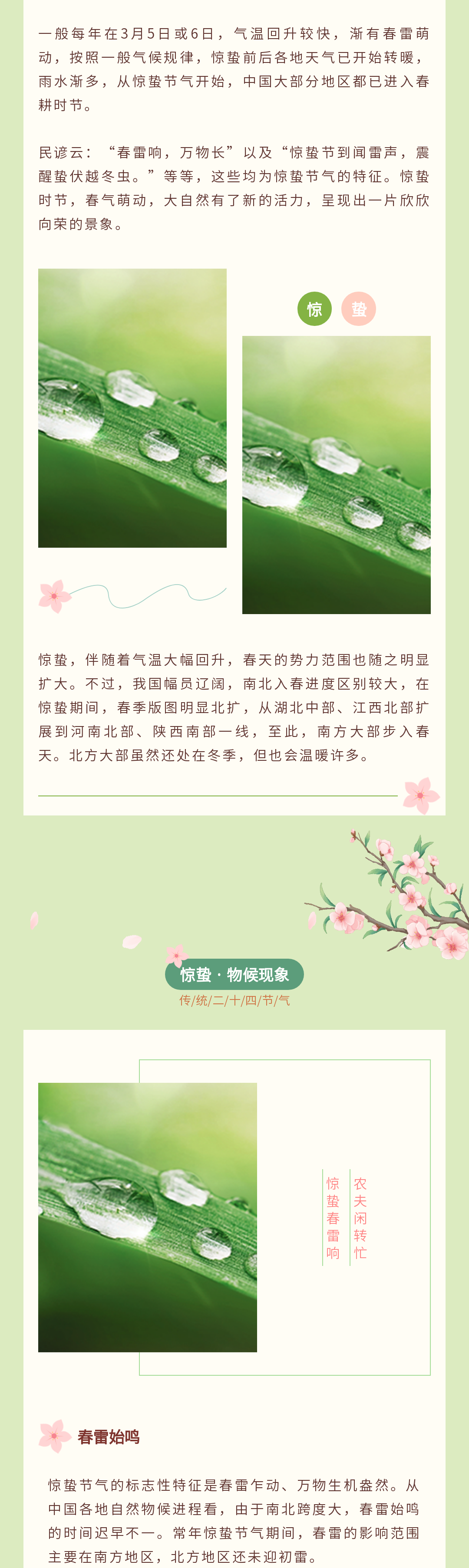 2024年3月5日驚蟄將至,萬物復蘇。在比格設計和135編輯器,你可找到精美驚蟄海報和模板,輕松打造個性化圖文。驚蟄是仲春時節(jié),春雷初響,萬物復蘇,寓意生命力和希望。