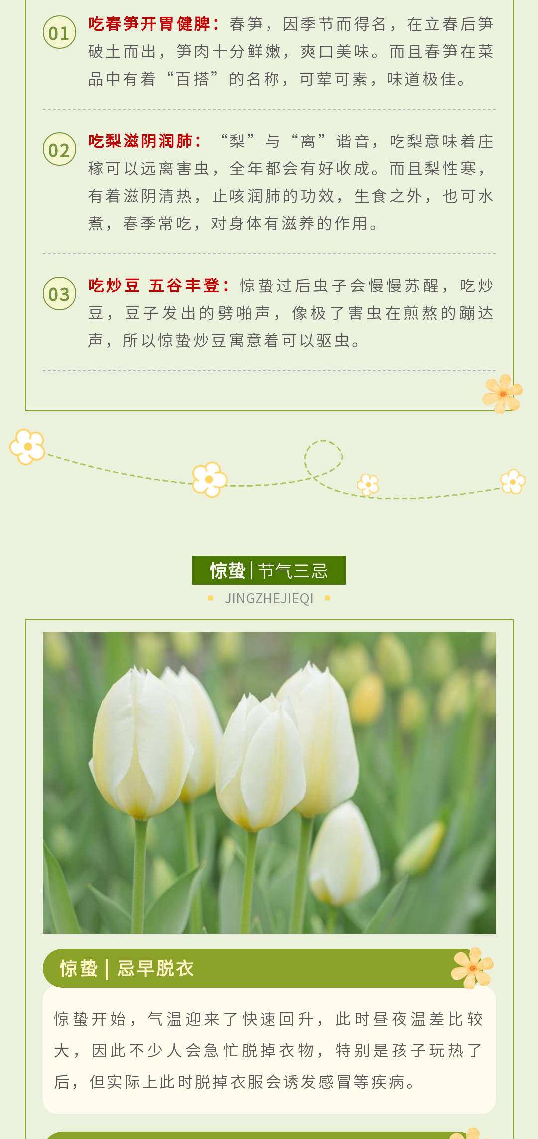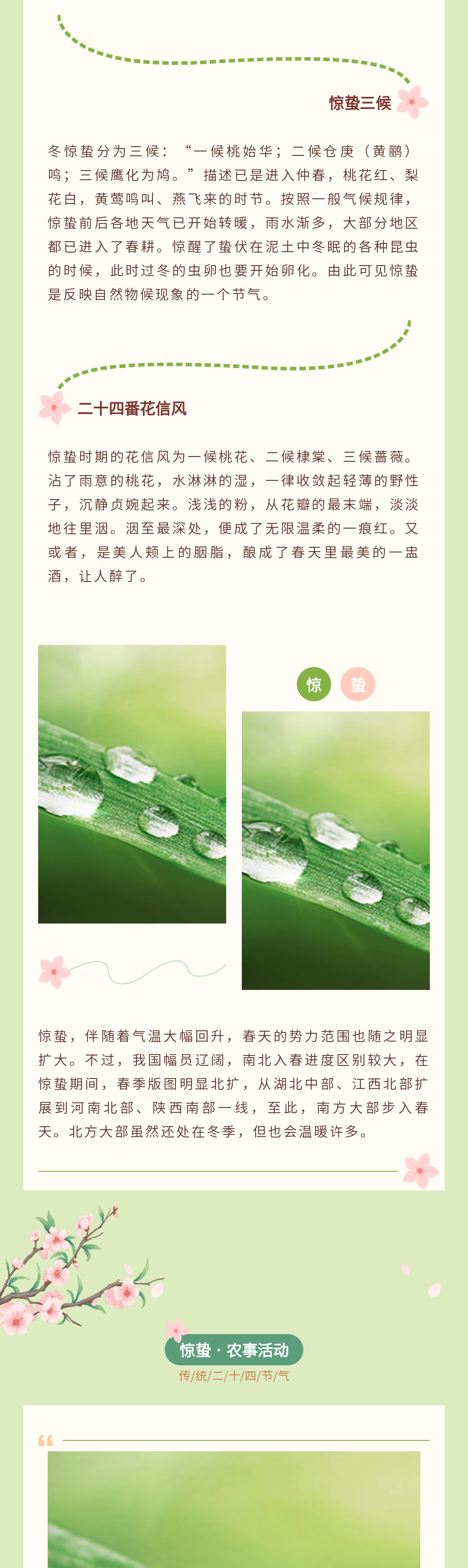 驚蟄,又名“啟蟄”,是二十四節(jié)氣中的第三個節(jié)氣。斗指甲,太陽到達黃經(jīng)345°,于公歷3月5-6日交節(jié)。驚蟄反映的是自然生物受節(jié)律變化影響而出現(xiàn)萌發(fā)生長的現(xiàn)象。