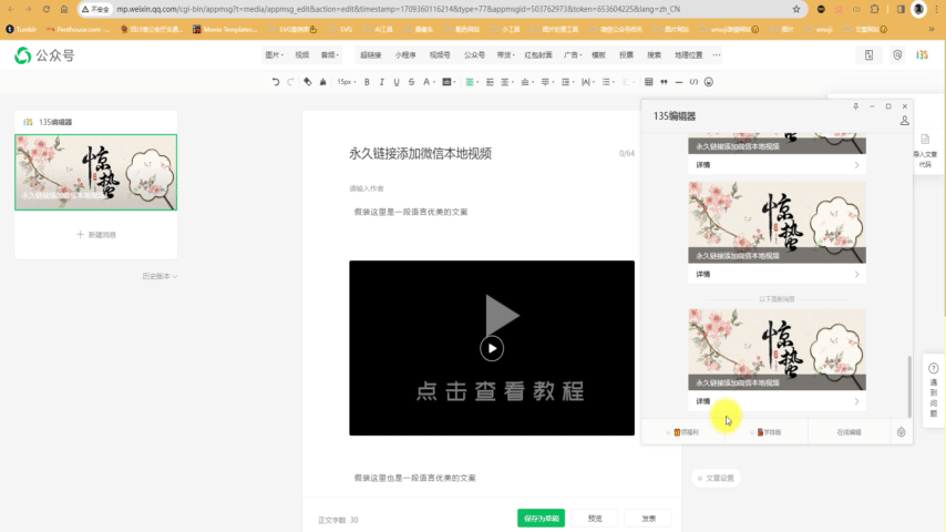 解鎖永久鏈接添加視頻的秘密!想要在135編輯器生成的永久鏈接中展示微信本地視頻?答案在這里!本文將指導(dǎo)您如何將視頻上傳至騰訊視頻并插入到135編輯器中,實(shí)現(xiàn)永久鏈接內(nèi)視頻內(nèi)容的展示。別再讓視頻內(nèi)容在鏈接中隱身了,跟著三兒一起學(xué)習(xí),讓您的內(nèi)容更生動(dòng)、更吸引人!