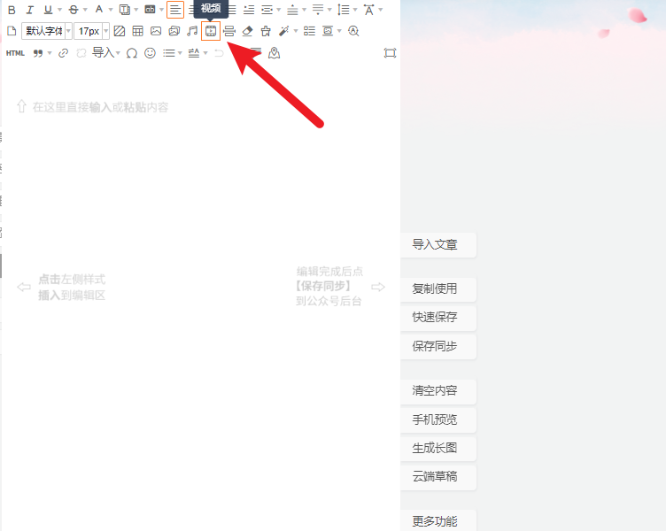 復(fù)制鏈接后回到135編輯器頁(yè)面,在編輯器上方找到【視頻】粘貼剛剛復(fù)制的視頻鏈接