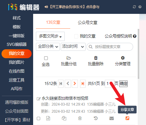 在編輯器左側(cè)找到【我的文章】點(diǎn)擊【分享】進(jìn)行永久鏈接審核,審核通過(guò)后可以選擇鏈接或二維碼發(fā)給甲方查看帶有視頻的永久鏈接內(nèi)容
