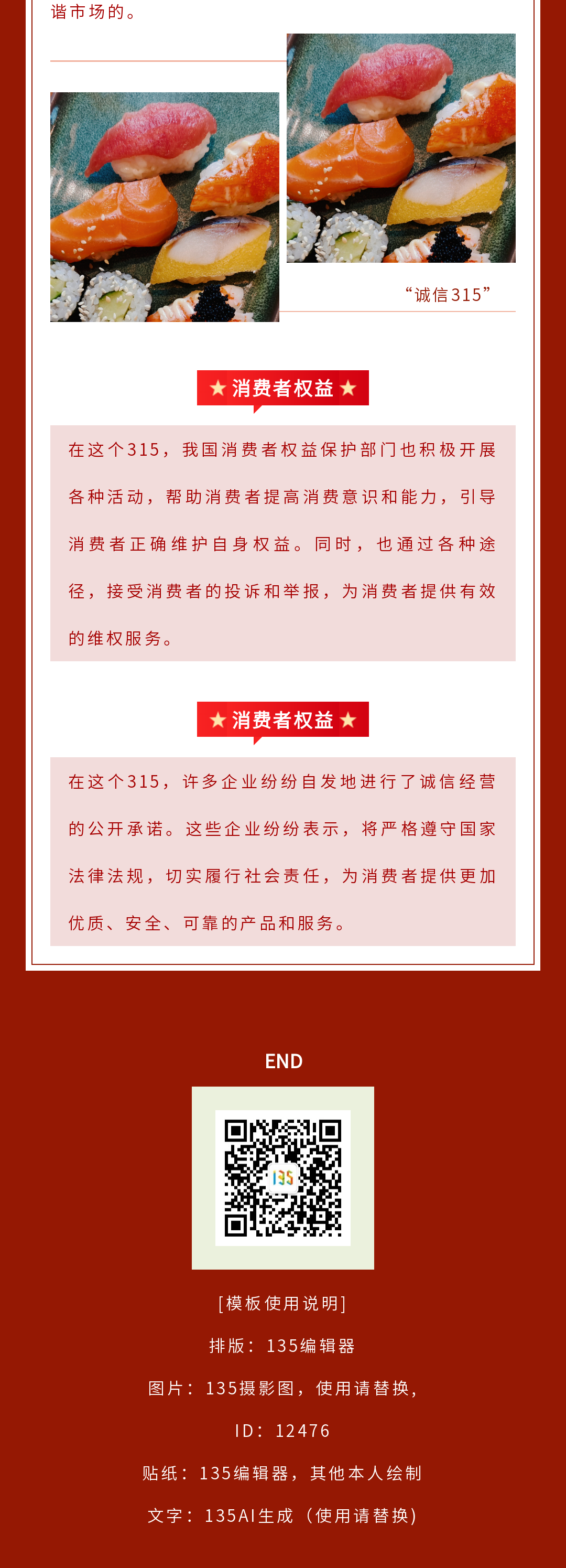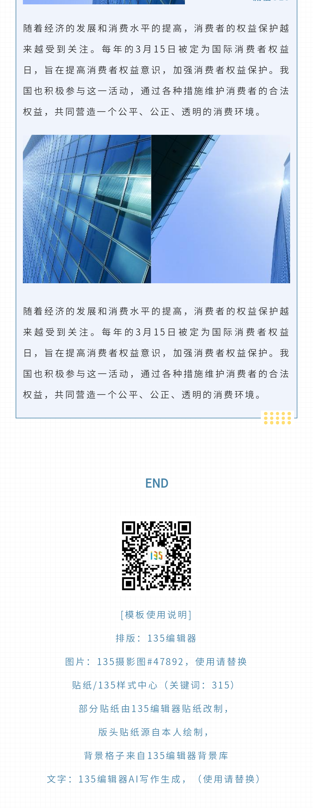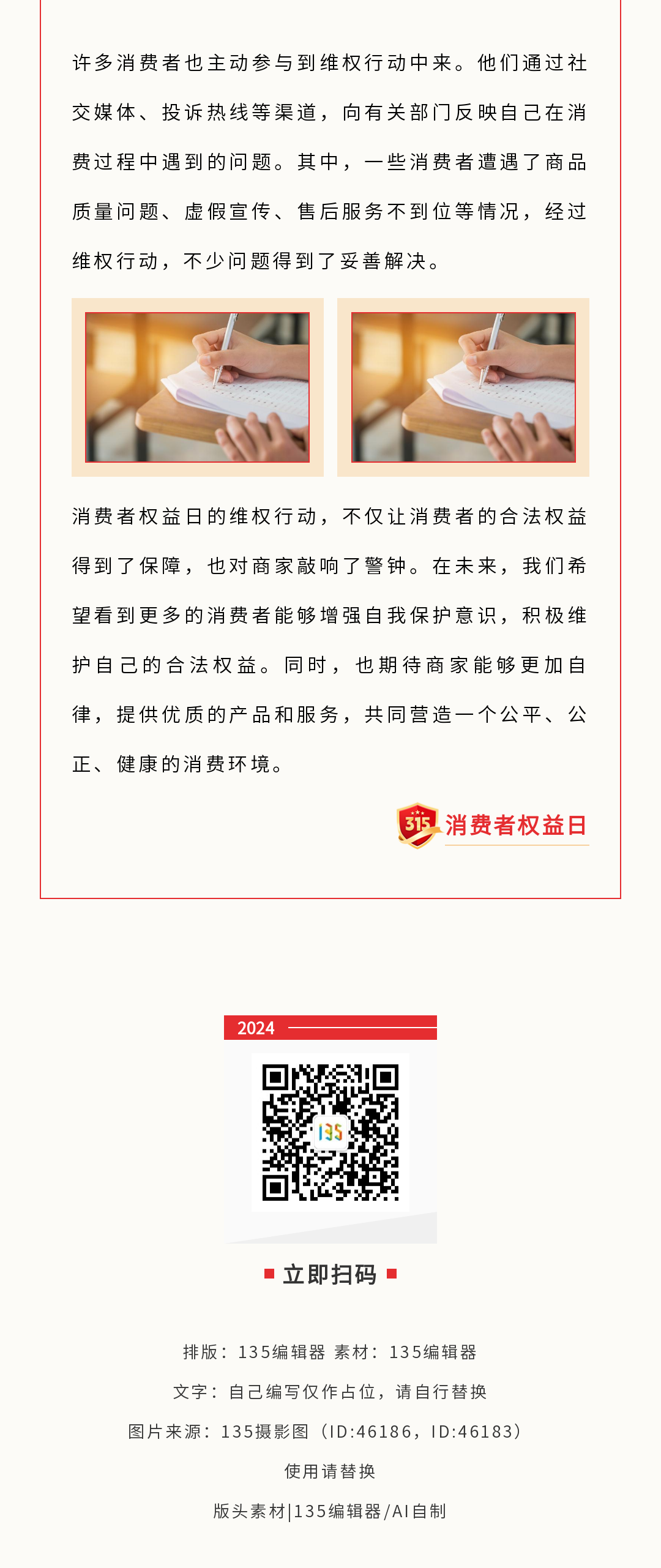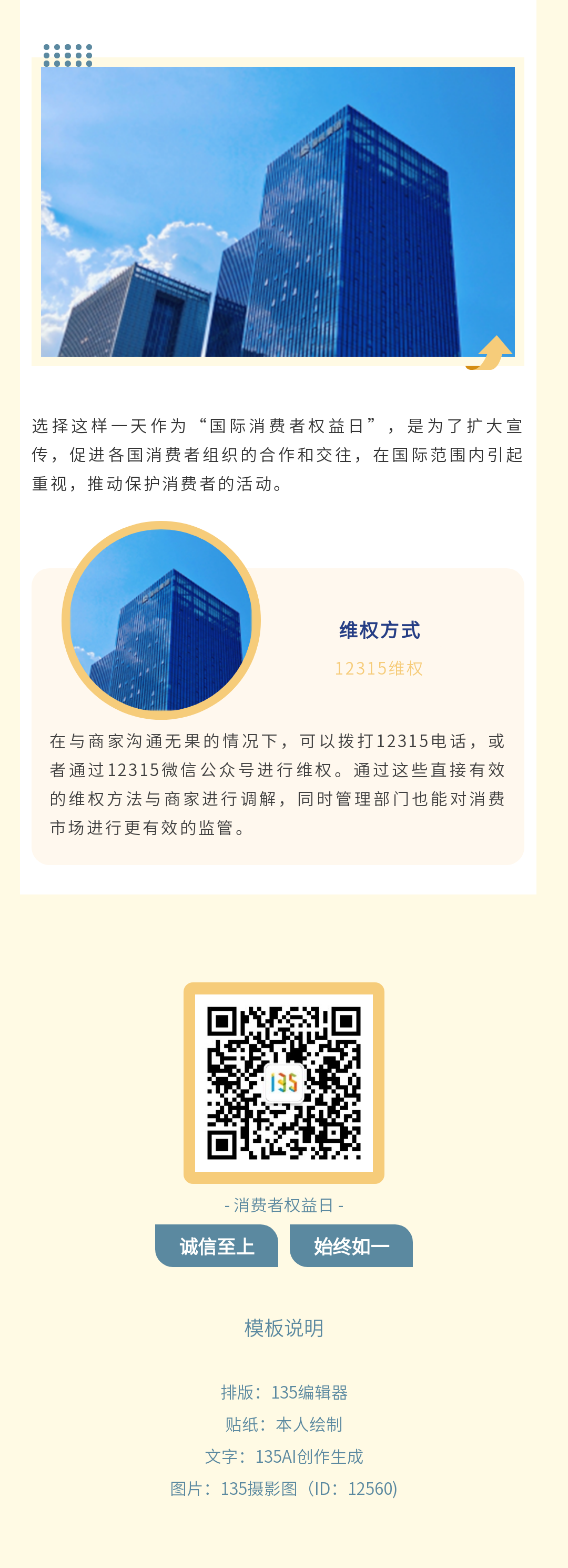 315消費(fèi)者權(quán)益日臨近,消費(fèi)者期待晚會(huì)曝光不良企業(yè)。135編輯器推出新款樣式、模板,助力企業(yè)展示誠(chéng)信。消費(fèi)者權(quán)益日海報(bào)、樣式豐富多樣,提醒消費(fèi)者積極行使和維護(hù)自身權(quán)益。同時(shí),新媒體訓(xùn)練營(yíng)即將開(kāi)營(yíng),助您深入學(xué)習(xí)公眾號(hào)知識(shí)。