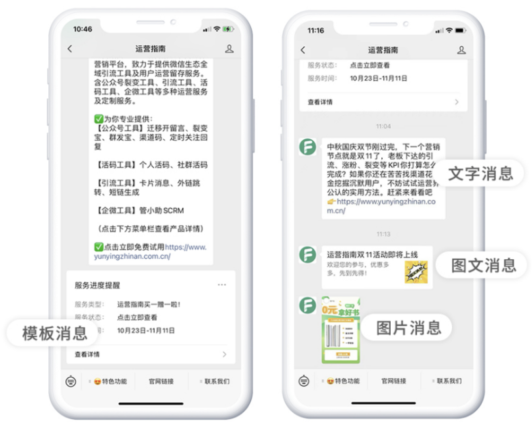 可以是圖文消息、圖片、文字或模版消息,不占用公眾號規(guī)定的群發(fā)次數(shù),支持按分組發(fā)送,支持定時任務群發(fā)(提前設置好群發(fā)內(nèi)容,到時間系統(tǒng)自動群發(fā)),精準觸達粉絲,不錯失任何一個潛在的易被轉(zhuǎn)化的流量!