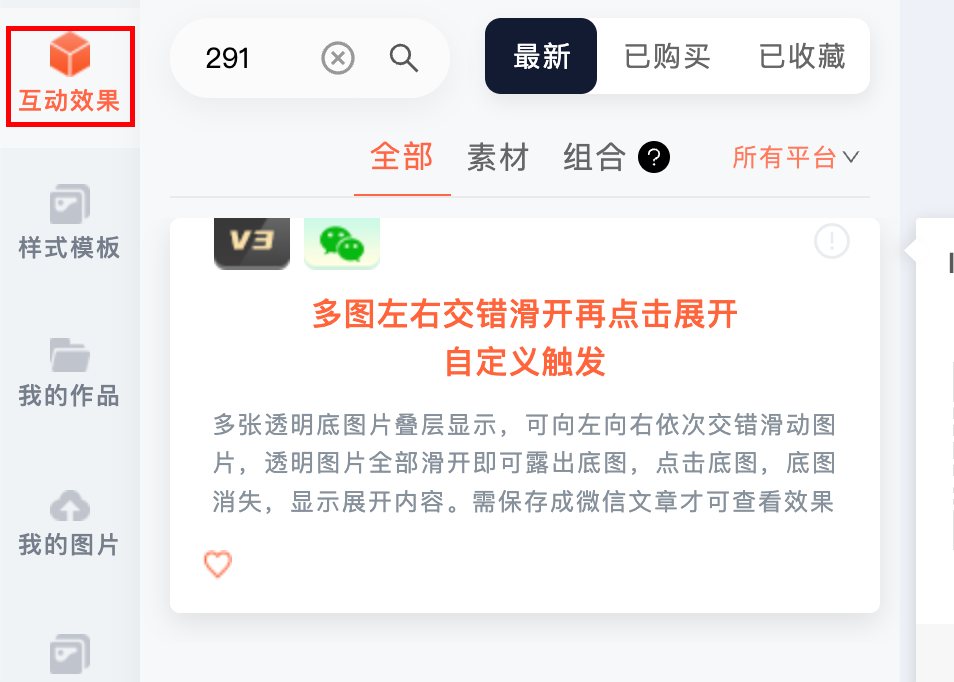 首先我們需要進(jìn)入到SVG編輯器中,在【滑動(dòng)效果】中搜索關(guān)鍵詞:左右交錯(cuò)滑開,或者是輸入ID:291。