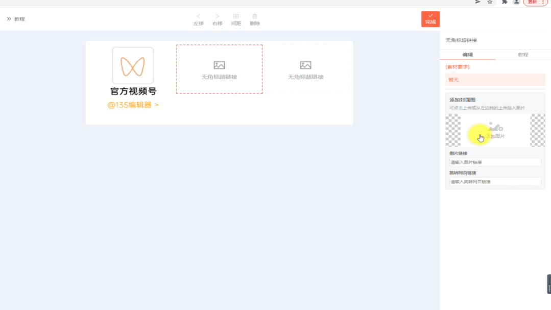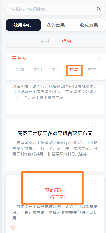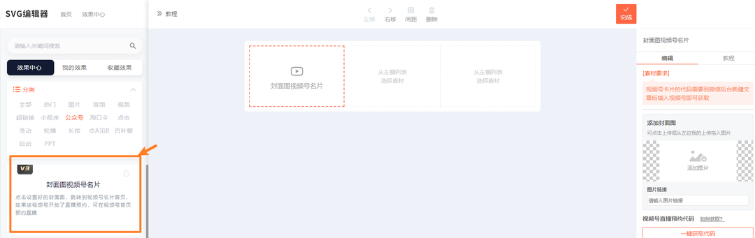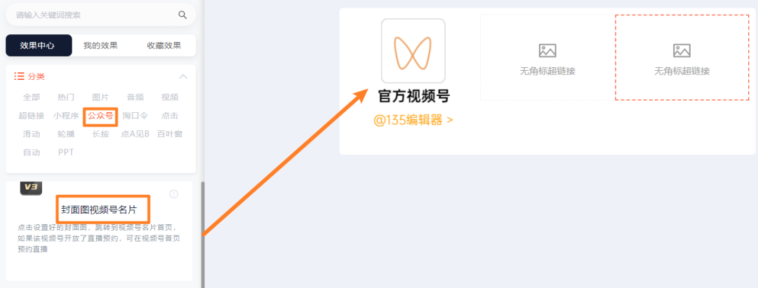 選擇「布局」??「基礎布局一行三列」??添加「封面圖視頻號名片」??添加「無角標超鏈接」