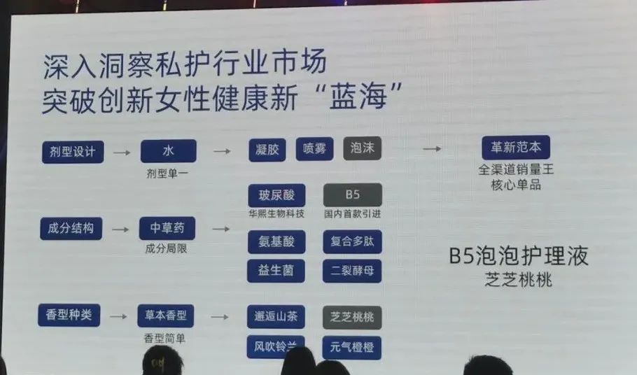 為了改善品牌老化,重新喚活,實(shí)現(xiàn)老國貨的品牌升級(jí),需要從品類和產(chǎn)品兩方面入手。作為女性私護(hù)行業(yè)的產(chǎn)品,潔爾陰的升級(jí)方向主要包含劑型設(shè)計(jì)、成分結(jié)構(gòu)、香型種類等,如果只進(jìn)行市場調(diào)研和競品觀察,很容易就能發(fā)現(xiàn)市面上最常見的便是“水劑-中草藥成分-草本香型”的經(jīng)典組合。然而,若是只調(diào)研市場數(shù)據(jù),潔爾陰僅需要調(diào)整一下包裝設(shè)計(jì)就好,很難發(fā)現(xiàn)有效的產(chǎn)品迭代方向。所以,潔爾陰選擇從用戶洞察出發(fā),收集消費(fèi)者評(píng)價(jià)和消費(fèi)者痛點(diǎn),畢竟很有可能市面上所有的同類產(chǎn)品都尚未滿足消費(fèi)者的真正需求。潔爾陰的用戶洞察發(fā)現(xiàn)[3]:水劑的產(chǎn)品在使用過程中比較浪費(fèi),平均一瓶只能使用1-2個(gè)月,使用時(shí)無法很好地與私處接觸;對(duì)于女性的一些常見私護(hù)問題,配方中只使用中草藥成分,效果十分有限;與此同時(shí),草本香型也過于單一,無法滿足用戶對(duì)不同香型的喜好。于是,潔爾陰在水劑之外又設(shè)計(jì)出了凝膠、噴霧、泡沫等新的劑型,進(jìn)一步提升了用藥便利性和依從性,平均一瓶能夠使用更久;在堅(jiān)持傳統(tǒng)中草藥配方的基礎(chǔ)上,潔爾陰秉承中藥現(xiàn)代化的技術(shù)理念,運(yùn)用現(xiàn)代化設(shè)備技術(shù)對(duì)生產(chǎn)工藝等進(jìn)行了升級(jí)改造,研發(fā)出了氨基酸、益生菌、復(fù)合多肽、二裂酵母等復(fù)合成分,更是國內(nèi)首款引進(jìn)B5的產(chǎn)品;香型方面更是豐富多元,既有花香型,也有水果香型。三個(gè)方面的迭代,使得潔爾陰的產(chǎn)品打造出了革新范本,同時(shí)滿足了消費(fèi)者的使用體驗(yàn)、功效需求以及情緒價(jià)值,收獲了“B5泡泡護(hù)理液”這樣的核心單品,在全渠道銷量領(lǐng)先。圖片來源:GDMS演講《致真創(chuàng)新,洞察賦能品牌全生命周期新價(jià)值》,2023年12月