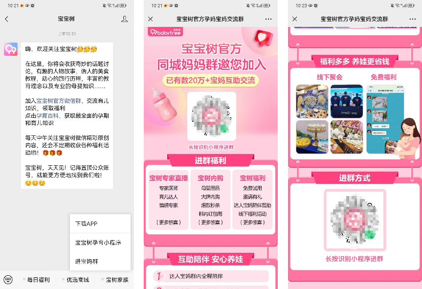 進(jìn)入“寶寶樹”公眾號,菜單欄有一個“寶樹家族”,會提供寶媽交流群的二維碼,進(jìn)入群后,流量自然到手。另一類女性APP,如美柚,會在APP內(nèi)設(shè)置一些育兒板塊,提供寶媽群。2)利用APP引流裂變