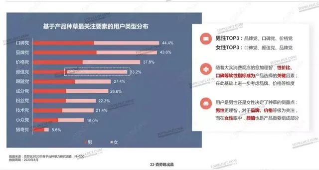 在產(chǎn)品種草偏好細(xì)分用戶占比情況以及性別差異上,女性的偏好的決定性因素TOP3分別為:口碑、顏值以及品牌。該數(shù)據(jù)說明,產(chǎn)品在寶媽群體中的口碑直接影響了對產(chǎn)品的接受程度,這就是“種草”的力量。