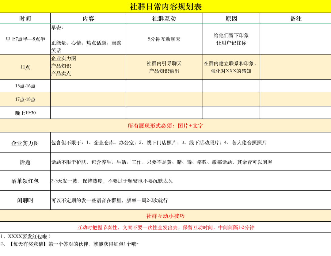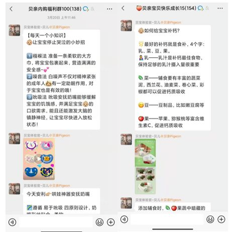 再說怎么規(guī)劃內(nèi)容。無論是朋友圈,還是社群,做內(nèi)容都需要提前規(guī)劃??此坪唵蔚墓ぷ?,實(shí)際操作過程中,經(jīng)常會出現(xiàn)漏發(fā)、錯發(fā)的情況。所以,這里建議你以周為單位,提前制作內(nèi)容規(guī)劃表,并準(zhǔn)備好相應(yīng)內(nèi)容或素材,形成sop,能使運(yùn)營工作清晰化、標(biāo)準(zhǔn)化、系統(tǒng)化。還有發(fā)布時間,建議放在早上10點(diǎn)、晚上22點(diǎn),通常是寶媽一天當(dāng)中最空閑的時間。例如在貝親的私域社群中,品牌對內(nèi)容進(jìn)行了細(xì)致的規(guī)劃,提供了豐富的育兒經(jīng)驗(yàn),兒童的營養(yǎng)搭配,兒童成長過程的心理變化等知識,這都是寶媽想要了解的內(nèi)容。