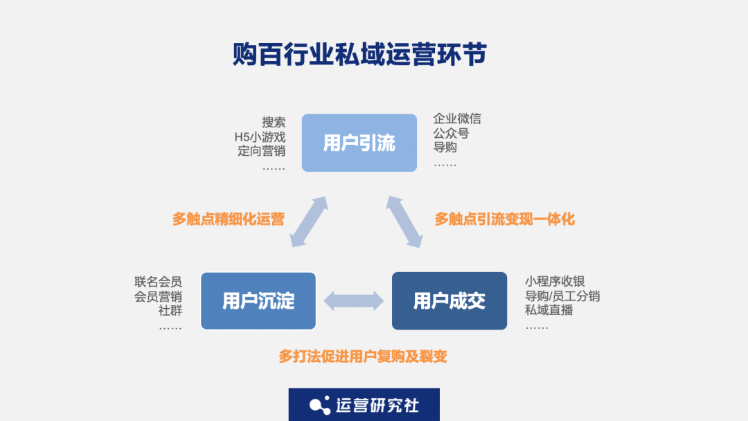 說(shuō)了購(gòu)百行業(yè)整個(gè)私域經(jīng)營(yíng)模式上的現(xiàn)狀及特征,就此也衍生出了購(gòu)百行業(yè)在「私域運(yùn)營(yíng)」上的特有打法。
