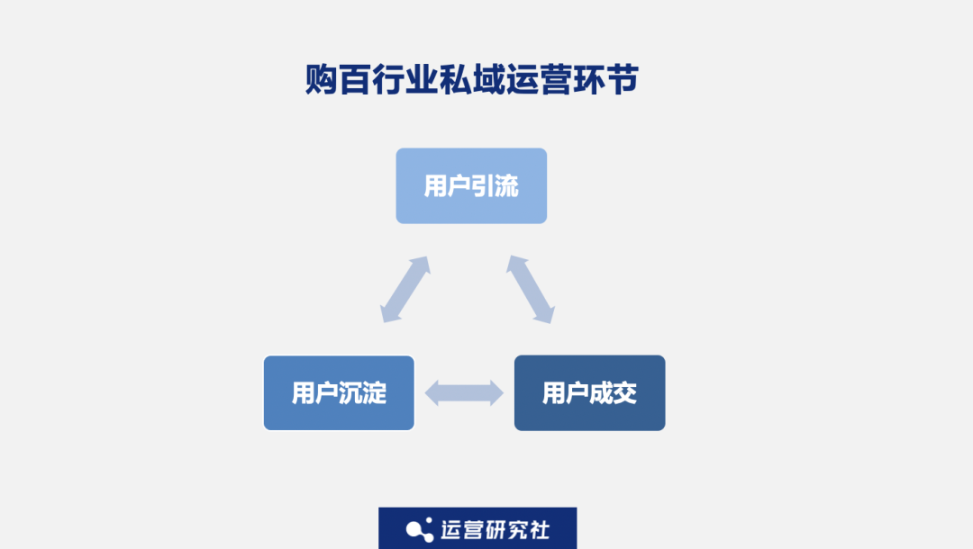 運(yùn)營(yíng)社注意到,購(gòu)百行業(yè)在私域運(yùn)營(yíng)中,主要考慮的是三個(gè)核心問(wèn)題:一是「用戶引流」,即線下門(mén)店的流量從哪里來(lái);二是「用戶成交」,即流量來(lái)了怎么形成增量交易;三是「用戶沉淀」,即解決私域用戶復(fù)購(gòu)及裂變。