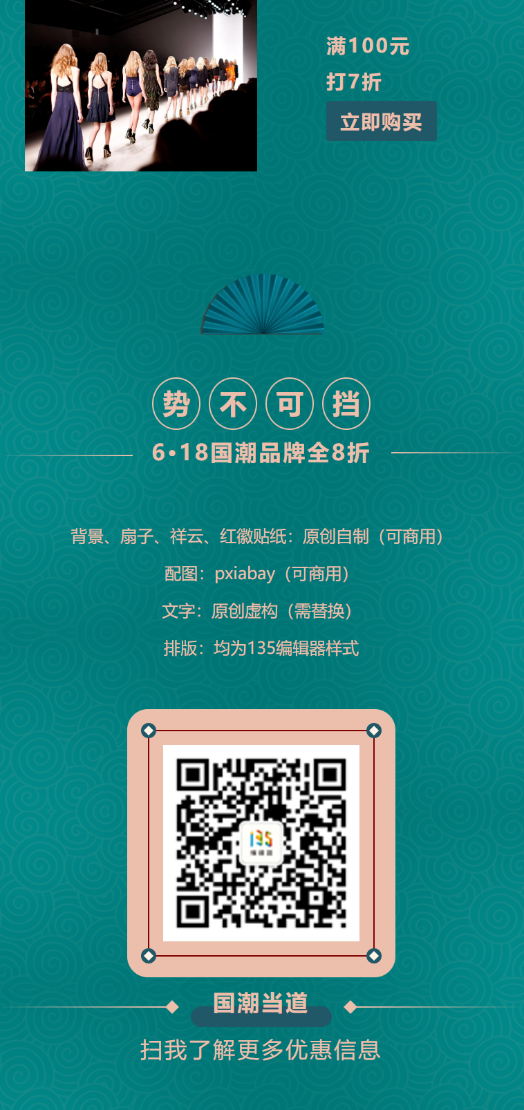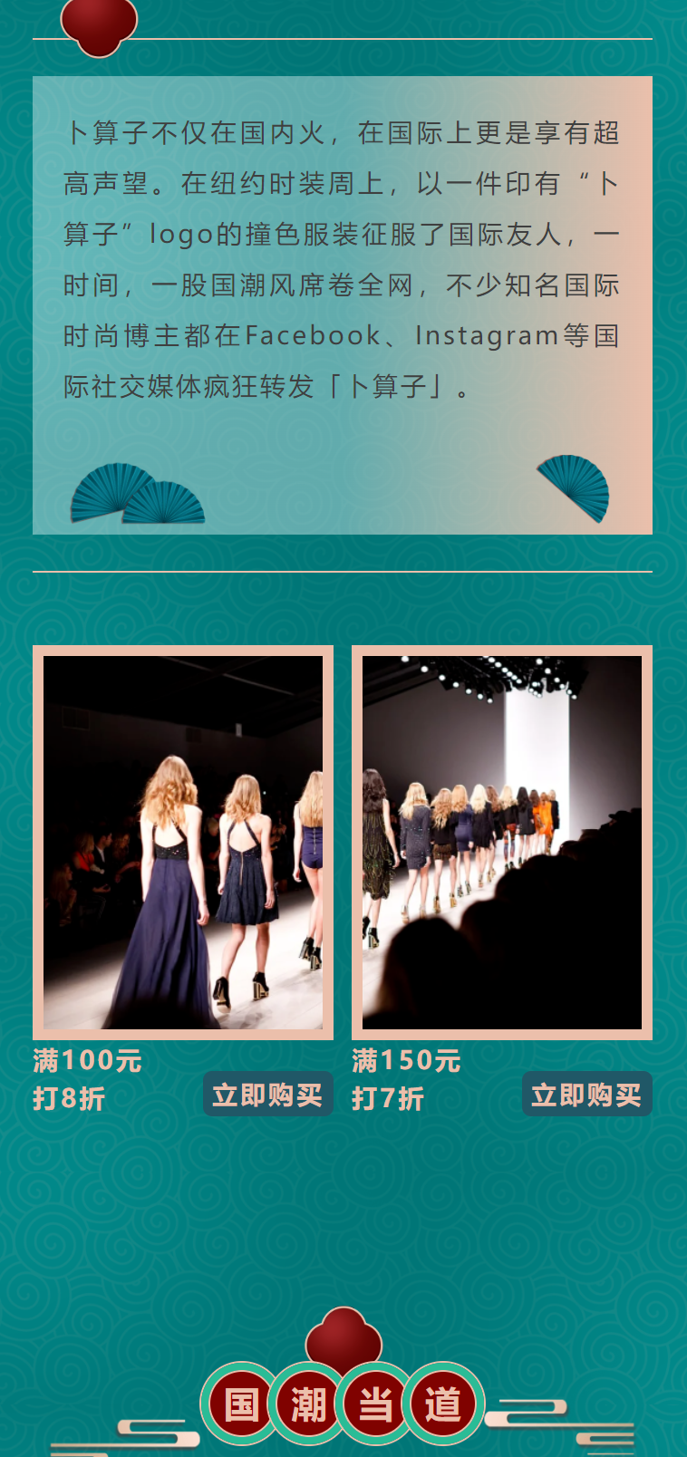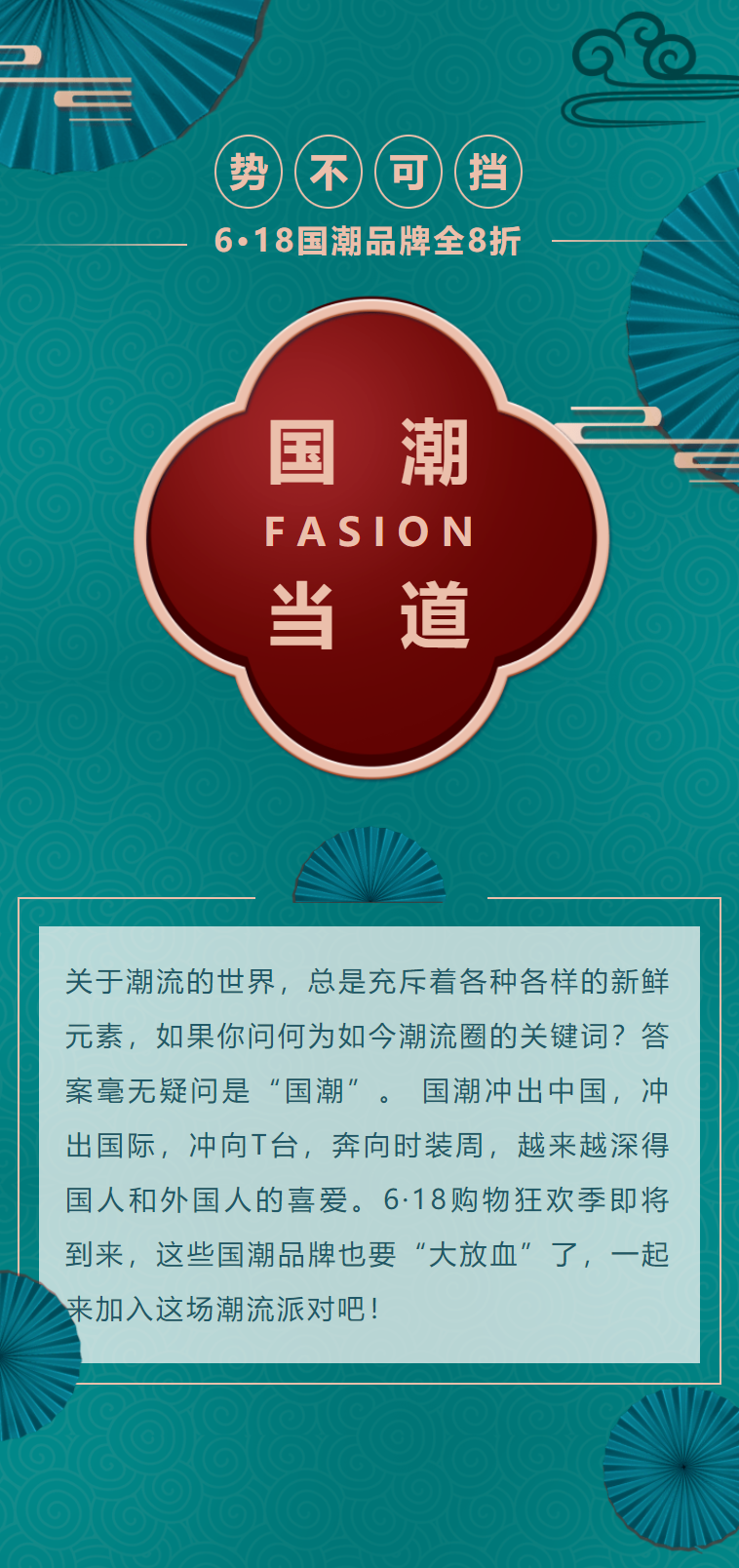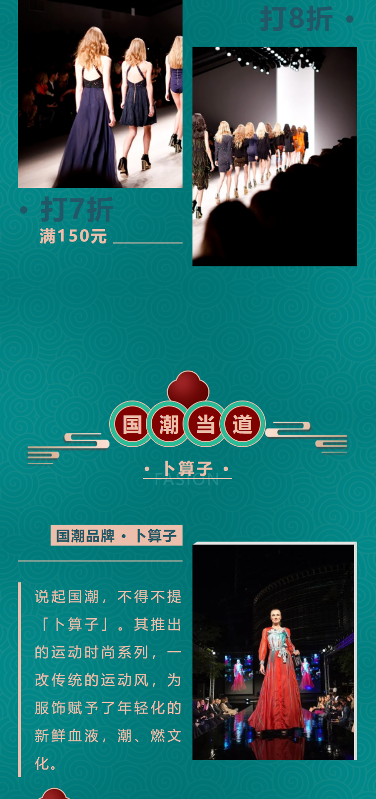 模板使用建議:此類風格偏中國風,整體配色由暗紅色和綠色組合,顏色對比明顯,能給人視覺沖擊感,適用于化妝品或者服裝行業(yè)以及一些國潮品牌。
