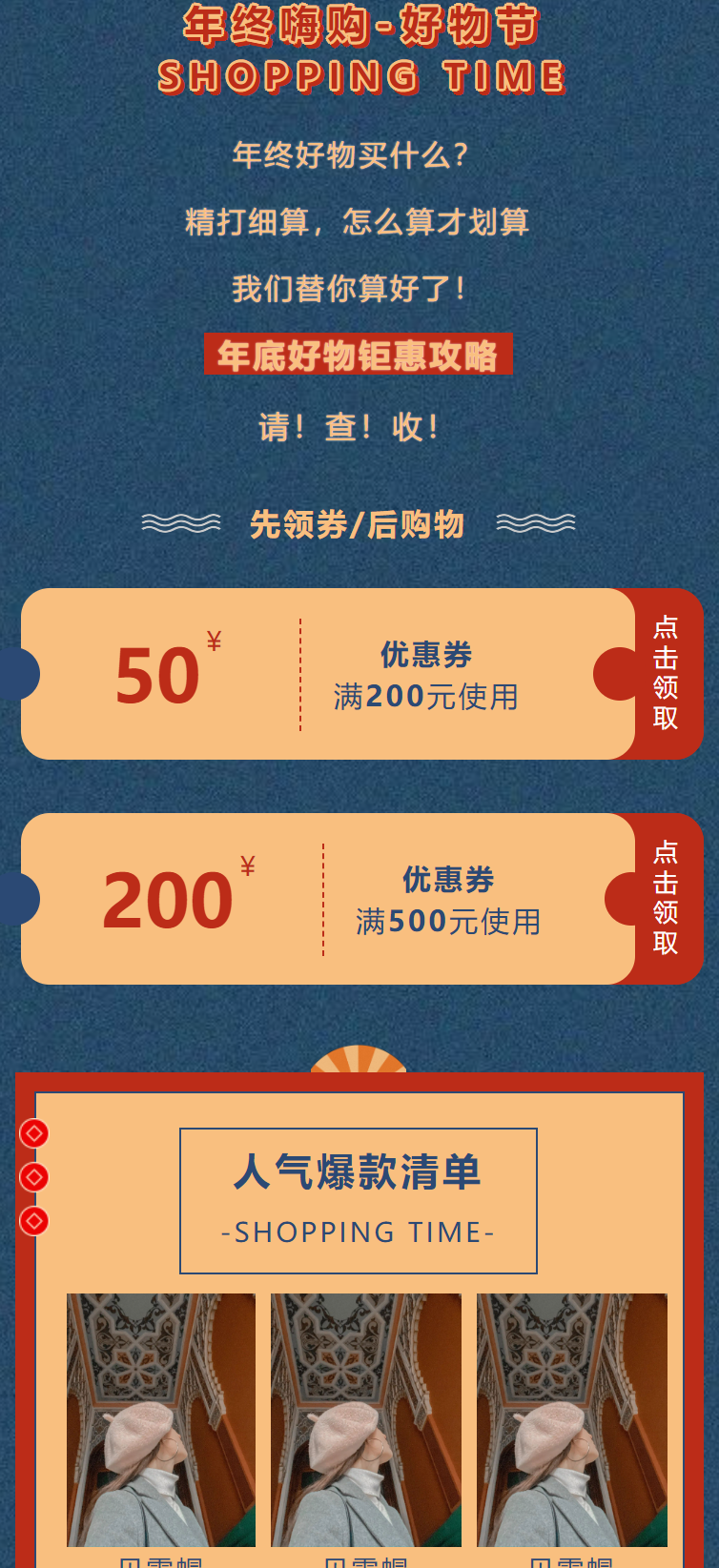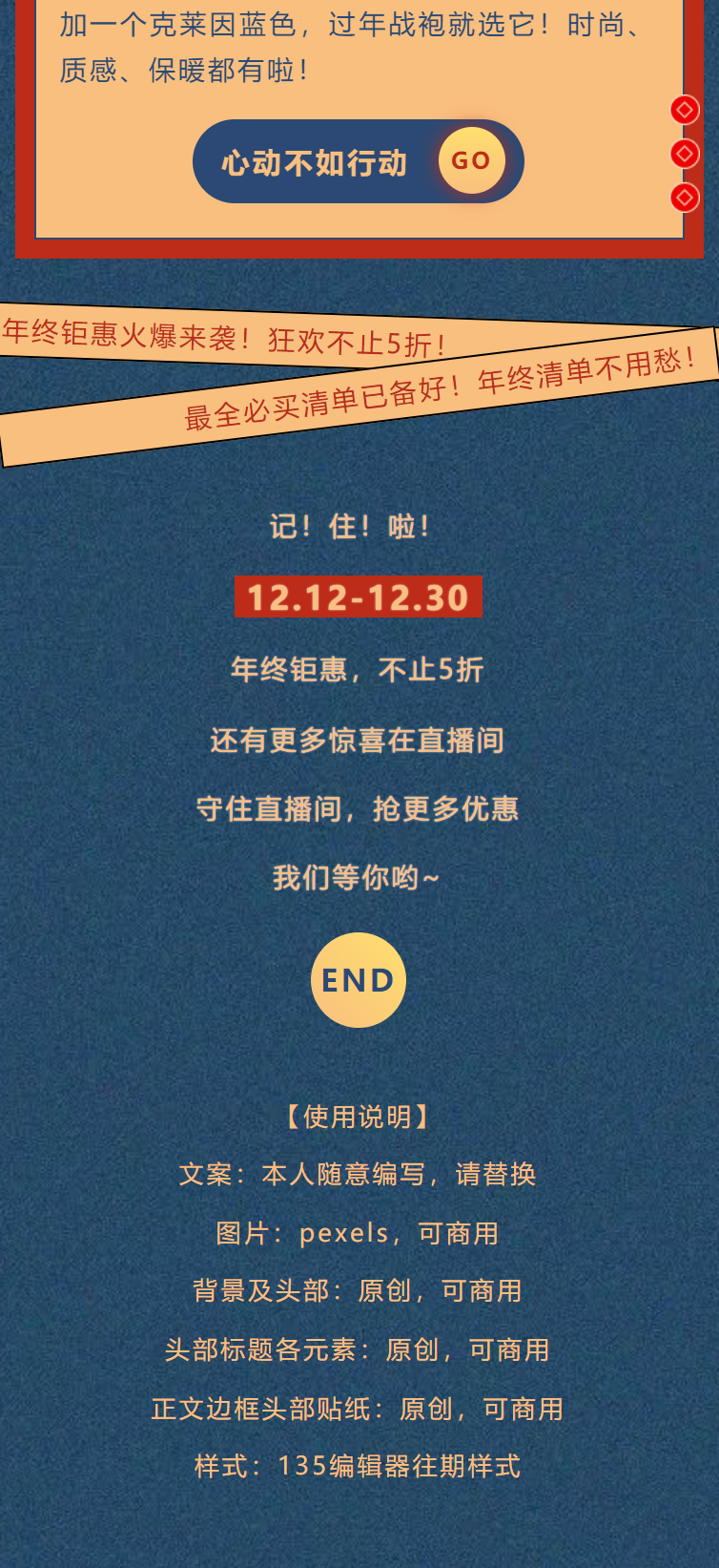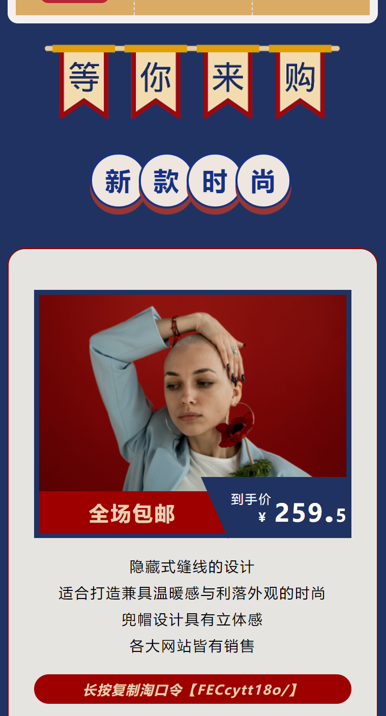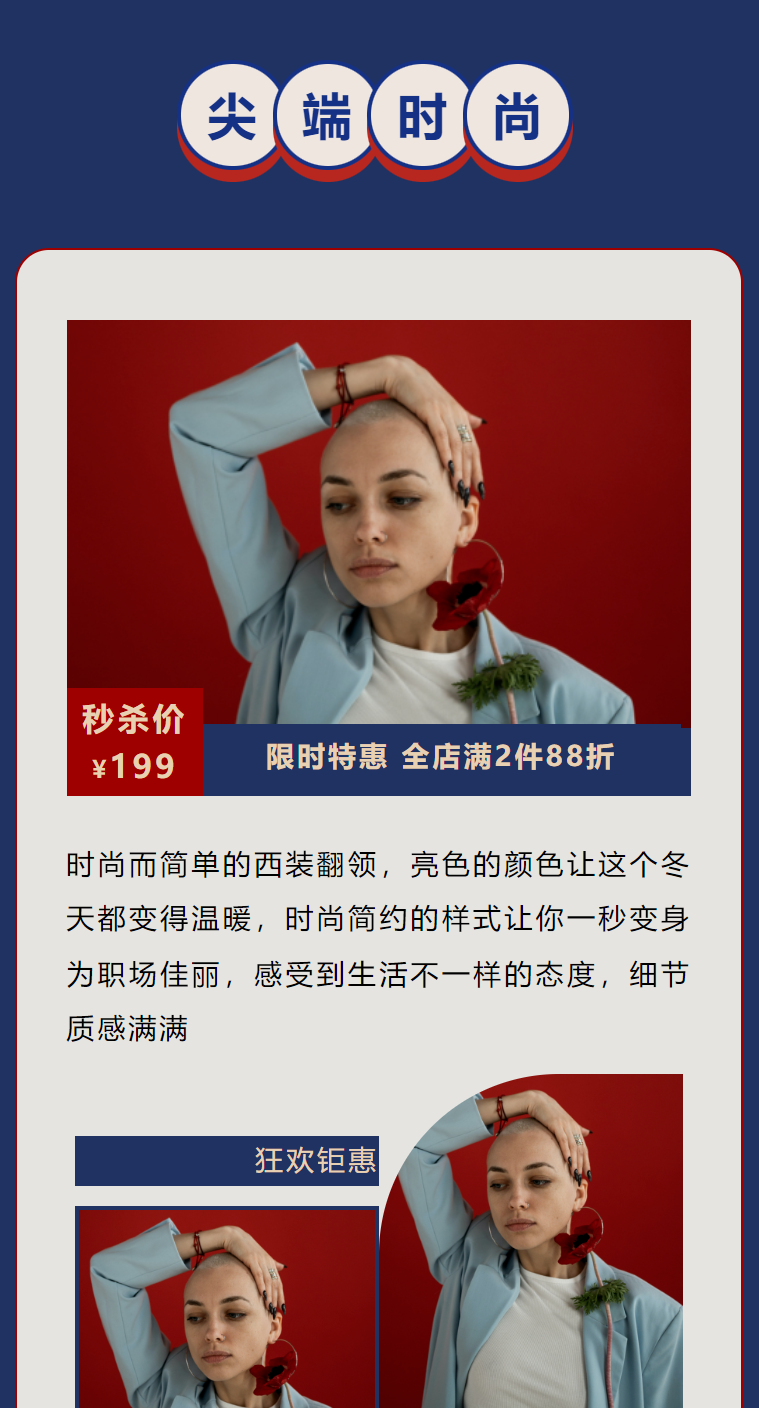 模板使用建議:這類風格的模板在顏色上會選擇對比度較高的,如深藍和深紅色,元素上會使用一些懷舊元素,傳遞出很濃的復(fù)古味兒~推薦服飾、化妝品以及一些擁有國貨品牌的行業(yè)使用。